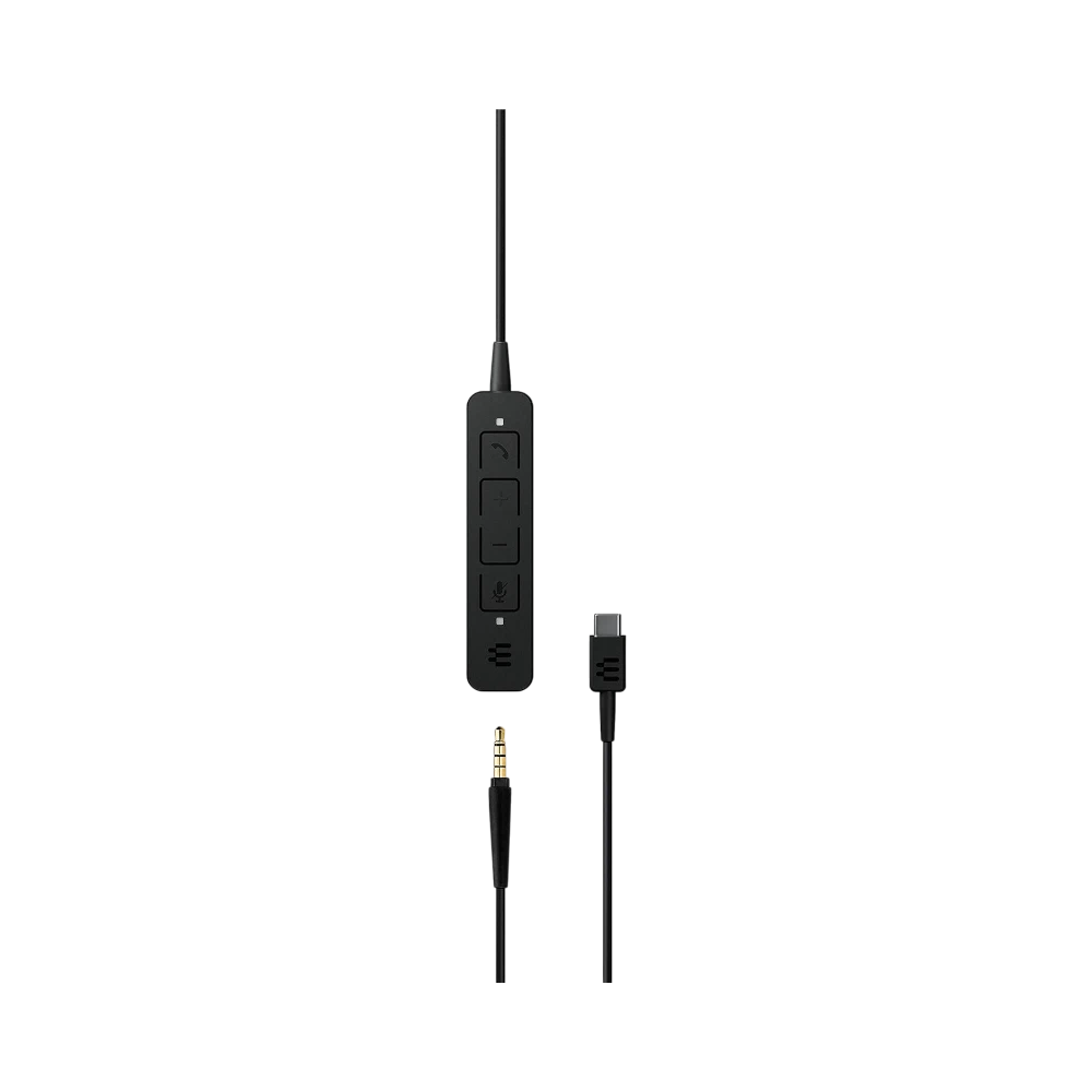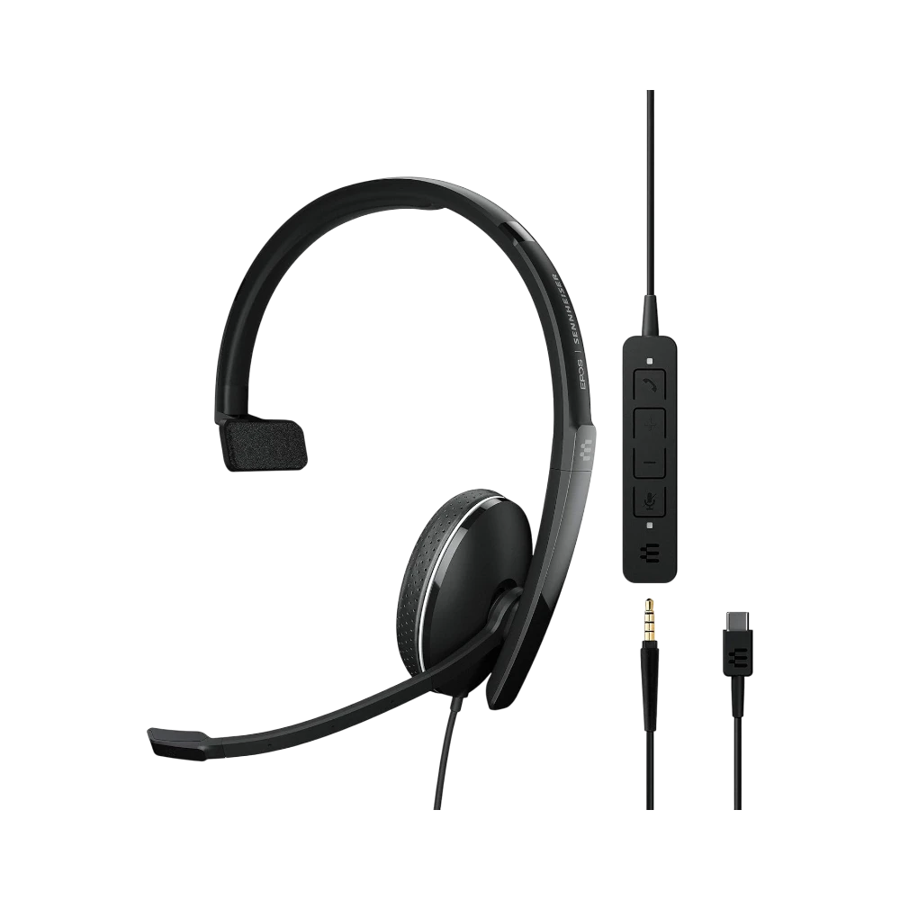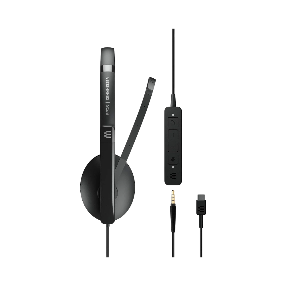 The EPOS 1000918 is a wired single-sided headset designed to deliver clear and reliable calls while keeping you aware of your surroundings. It connects via a detachable USB-C cable or a 3.5 mm jack, allowing seamless switching between laptops, phones, and tablets. The headset features a noise-canceling microphone with EPOS Voice technology to enhance speech clarity and reduce background noise, making it well suited for hybrid work environments and busy spaces.