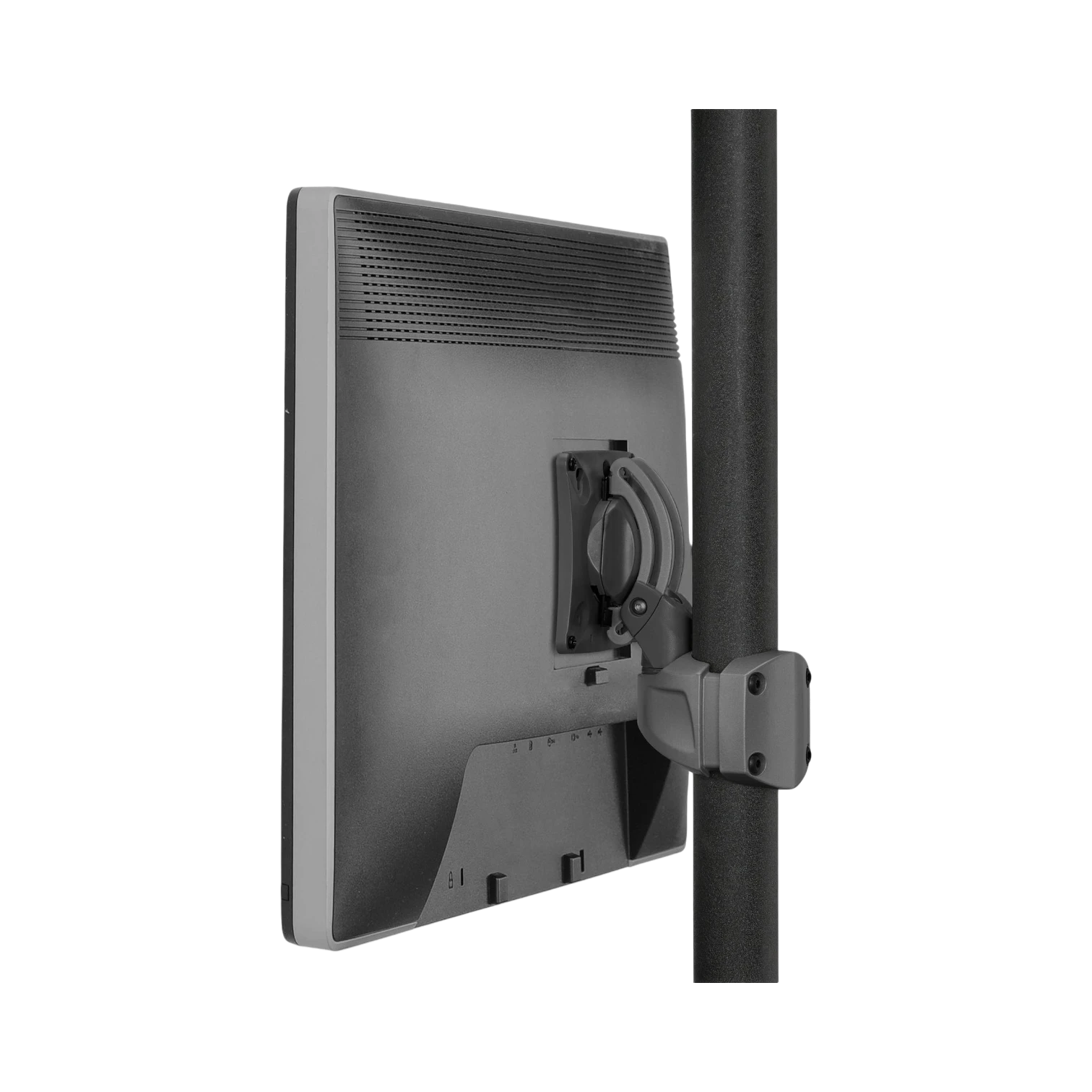 Installation is straightforward with a clamp that slides over the pole and tightens using the included hardware, requiring no special tools for tilt adjustments once mounted. The mount’s design ensures a secure fit on round poles within the specified diameter range, making it easy to retrofit existing setups or create new flexible monitor stations quickly.