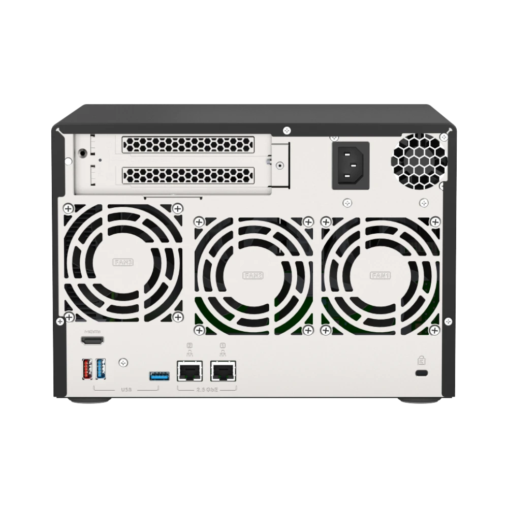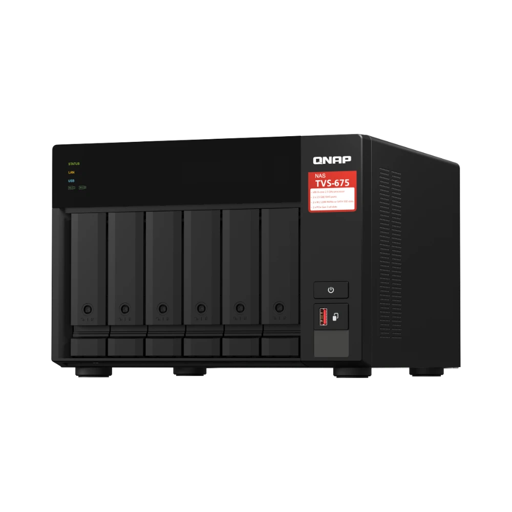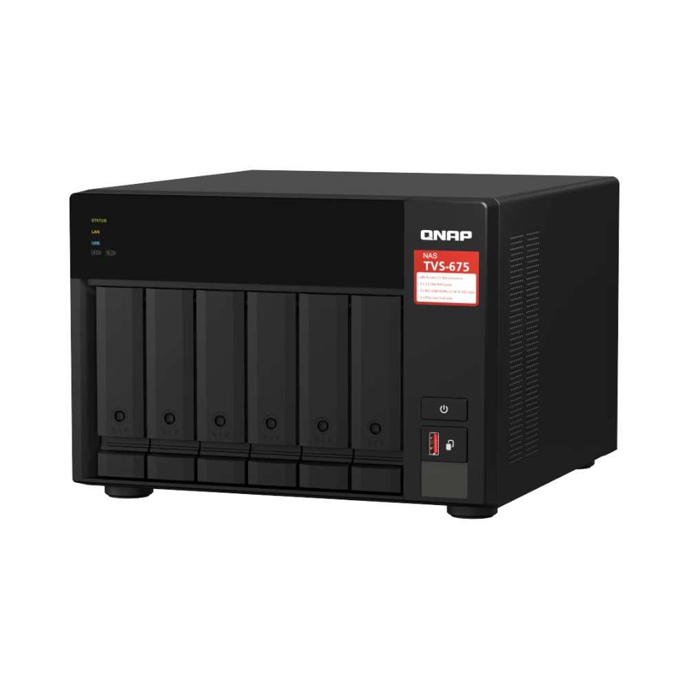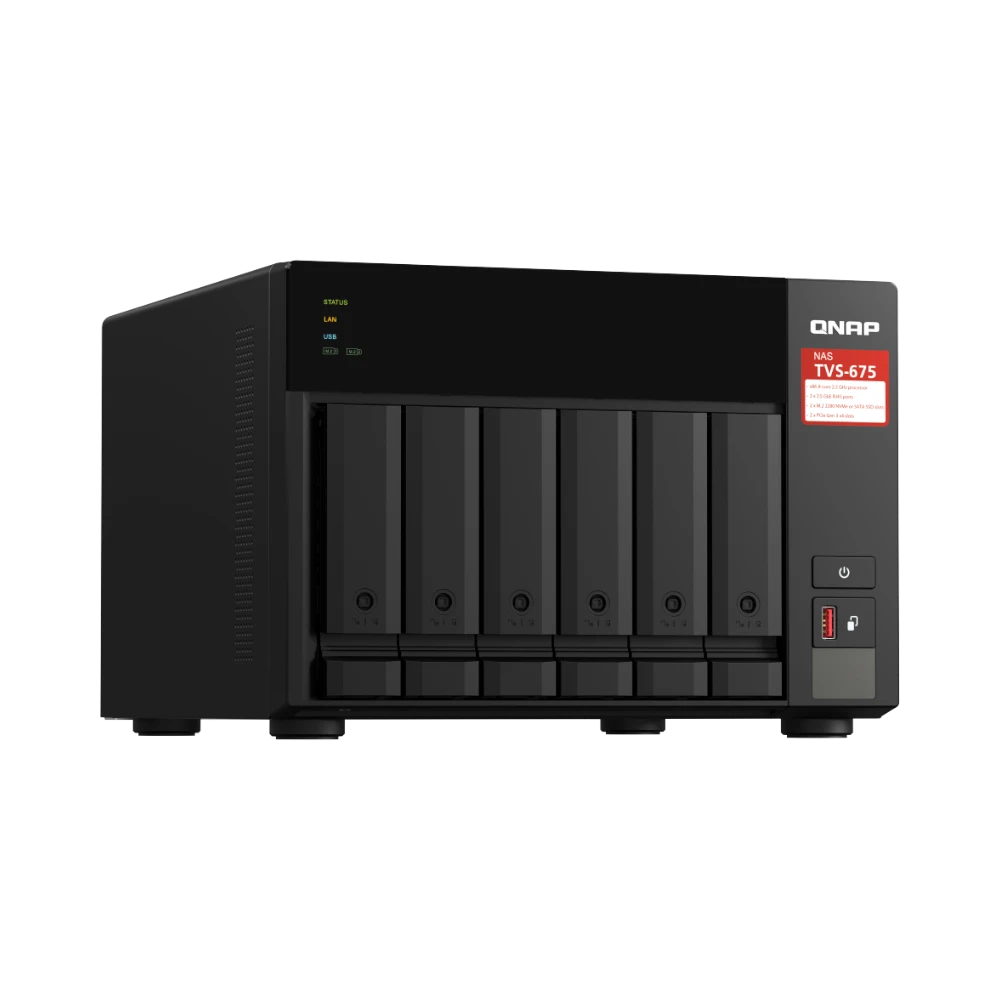 The QNAP TVS-675-8G-US is a six-bay network attached storage (NAS) enclosure designed to provide reliable, high-capacity storage for offices, creative studios, and advanced home users. Powered by an eight-core Zhaoxin KX-U6580 processor running at 2.5 GHz, it efficiently manages file sharing, backups, and multimedia streaming. With six bays supporting both 2.5-inch and 3.5-inch SATA drives, this NAS offers flexible storage expansion and robust RAID options to balance speed, capacity, and data protection.