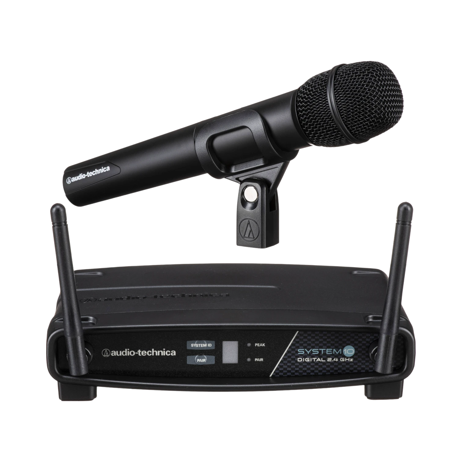 The Audio-Technica ATW-1102 is a wireless handheld microphone system designed to deliver clear and consistent audio using digital transmission in the license-free 2.4 GHz band. It features a handheld transmitter with a hypercardioid dynamic capsule paired with a tabletop receiver, providing up to seven hours of battery life and a working range of 100 feet. This system is ideal for users who need reliable wireless audio with minimal setup, such as educators, worship leaders, and mobile presenters.