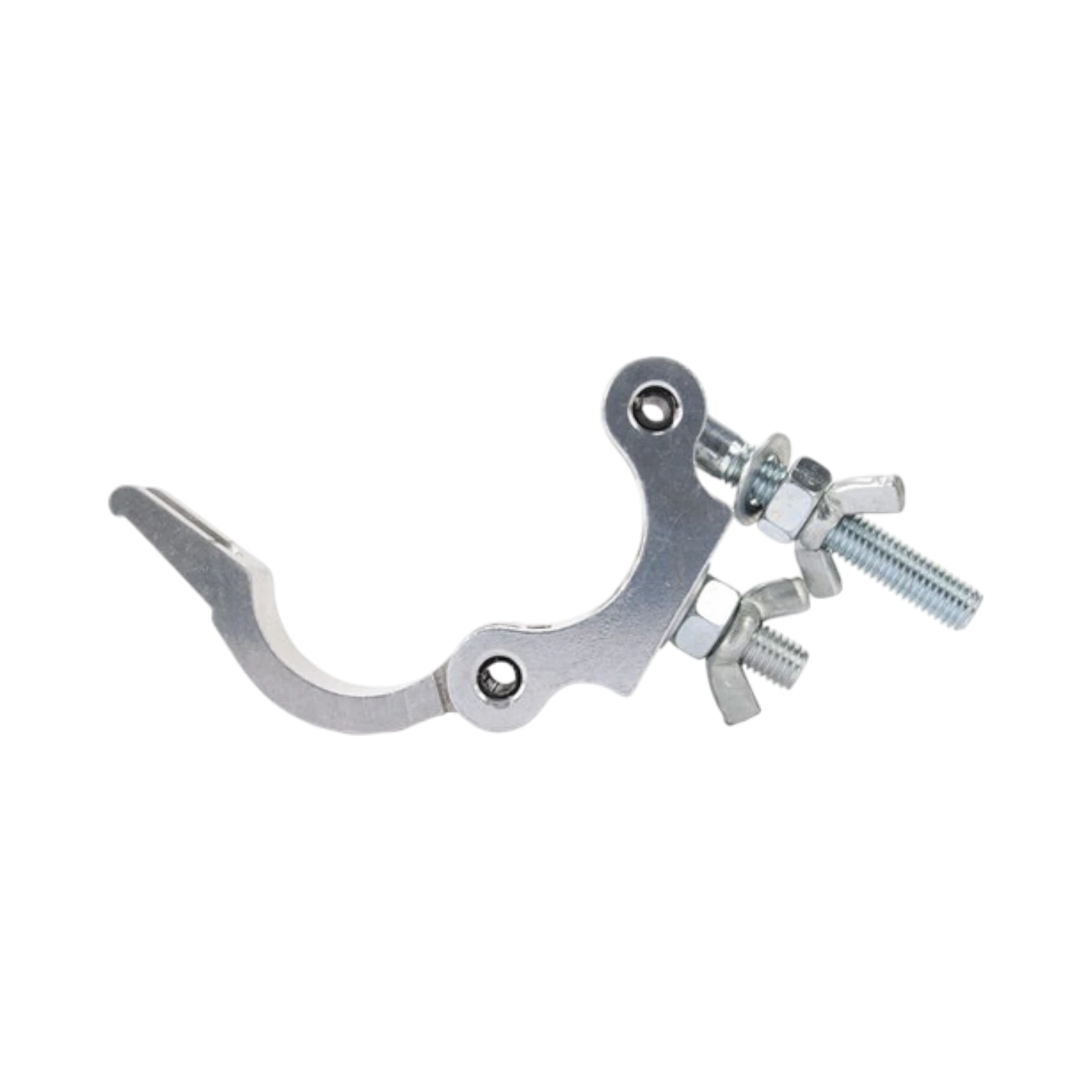 The ADJ PRO-CLAMP is a heavy-duty aluminum clamp designed to securely attach lighting fixtures and other stage equipment to standard 2 inch truss or pipe. Despite weighing only 1.3 pounds, it supports loads up to 1100 pounds, making it suitable for a wide range of applications including moving heads, video panels, and small line array elements. Its 360 degree wrap-around design ensures even weight distribution while protecting the pipe surface, providing a reliable hold for both temporary and permanent installations.