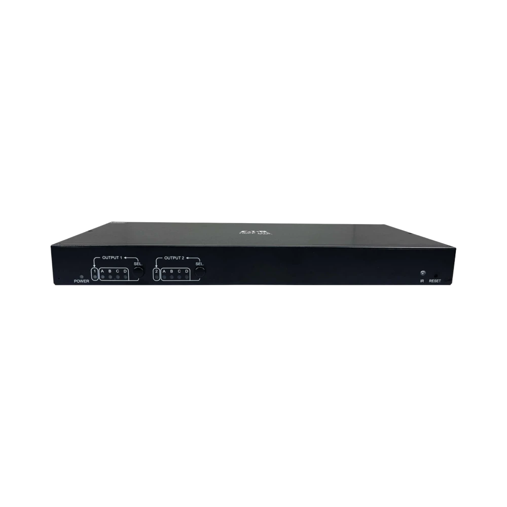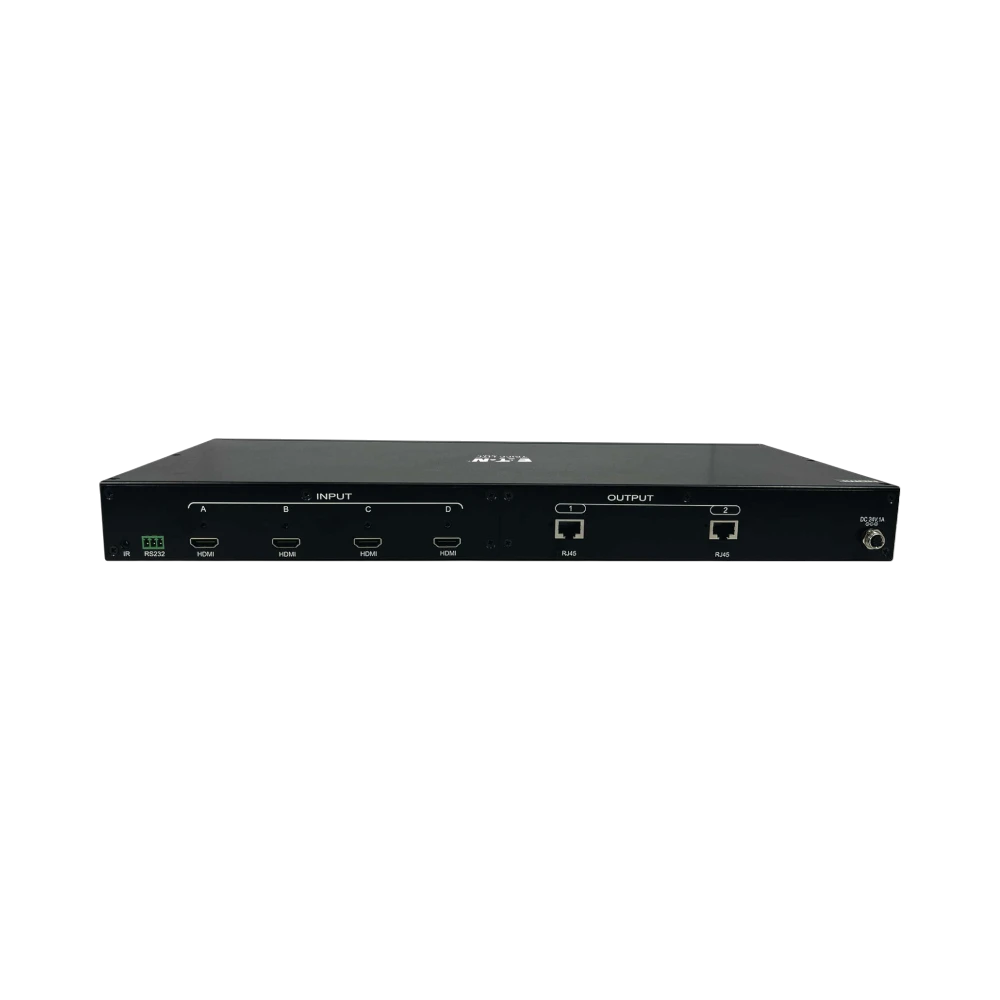 - Routes four HDMI sources to two independent displays over Cat6 cable runs up to 230 feet, reducing cable clutter and installation complexity