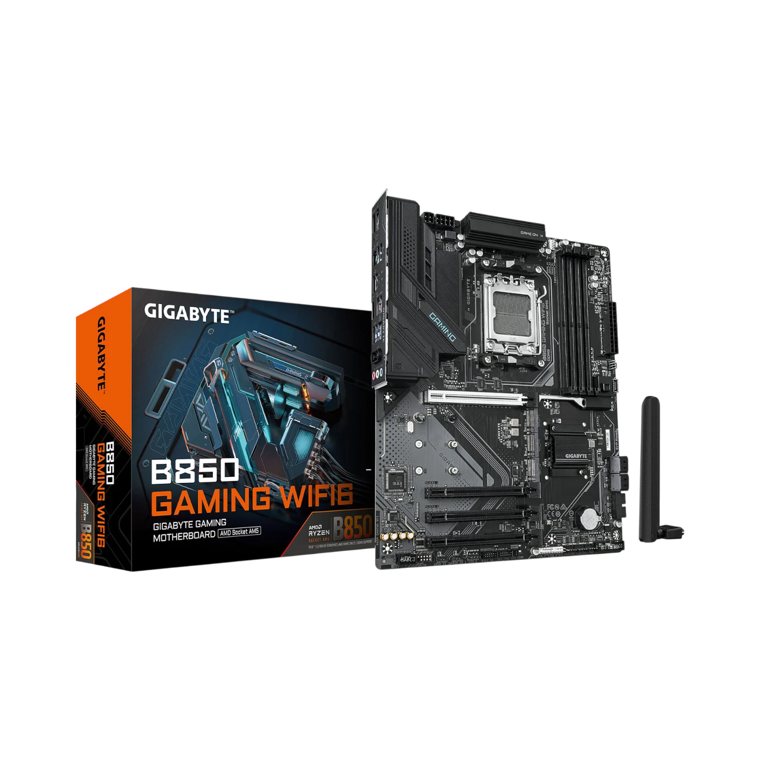 The Gigabyte B850 GAMING WIFI6 is an ATX motherboard designed to support AMD Ryzen 7000, 8000, and 9000 series processors using the AM5 socket and B850 chipset. It enables DDR5 memory speeds up to 8200 MT/s, providing ample performance for gaming and content creation. With multiple storage options including three M.2 slots—one supporting PCIe 5.0—and four SATA ports, it offers flexibility for large game libraries or extensive media projects. Networking is covered with built-in Wi-Fi 6, Bluetooth 5.3, and Gigabit LAN, while the rear I/O panel includes USB-C and several USB-A ports for versatile connectivity.