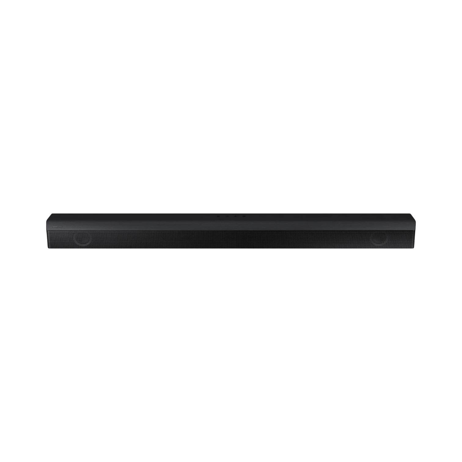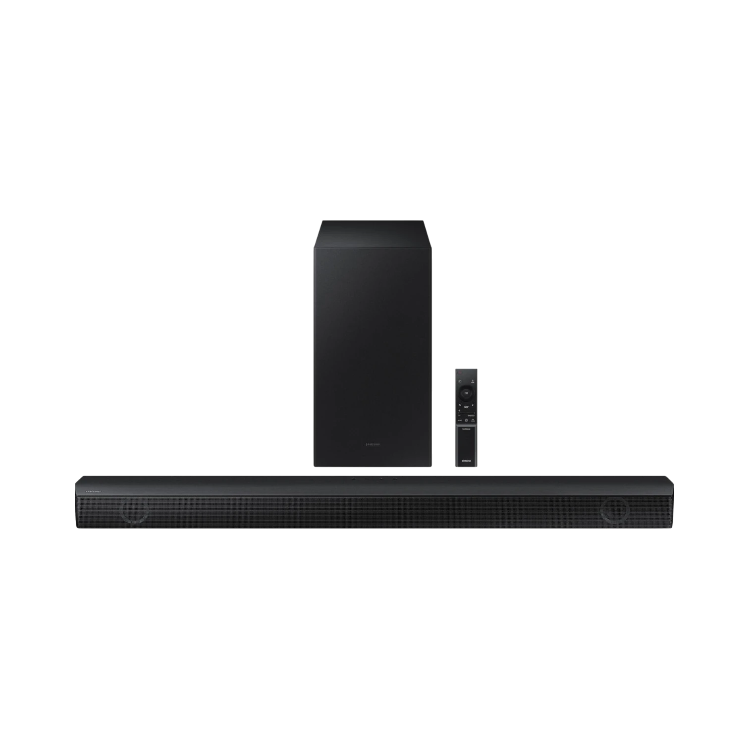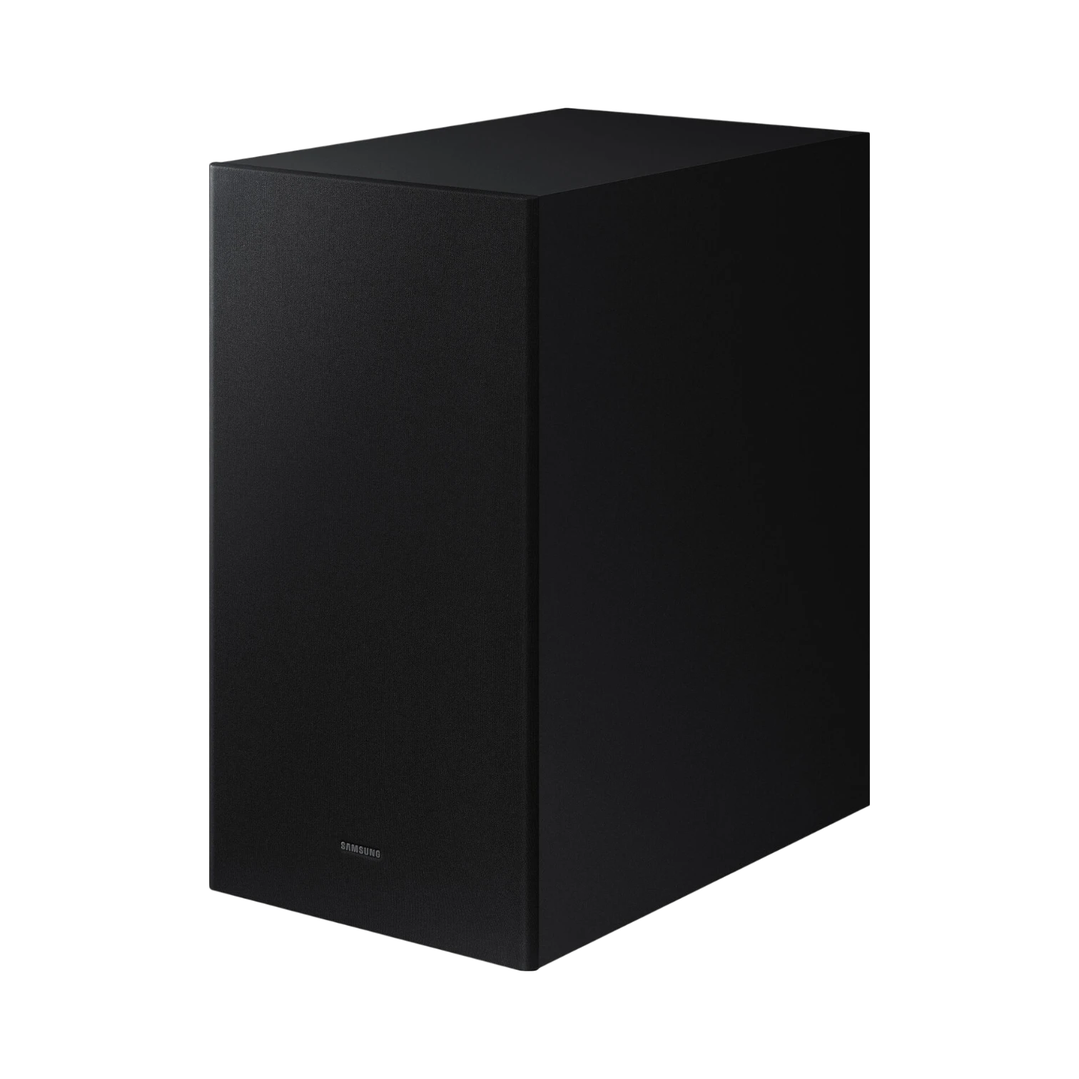 The Samsung HW-B550/ZA is a 2.1-channel soundbar system designed to enhance your TV’s audio with richer detail and deeper bass. Delivering up to 410 watts of total power, it combines a soundbar that handles dialogue and effects with a wireless subwoofer focused on low frequencies, filling most living rooms or dens with immersive sound. Setup is simple with HDMI ARC or optical input options, and Bluetooth connectivity allows seamless streaming from two devices simultaneously.