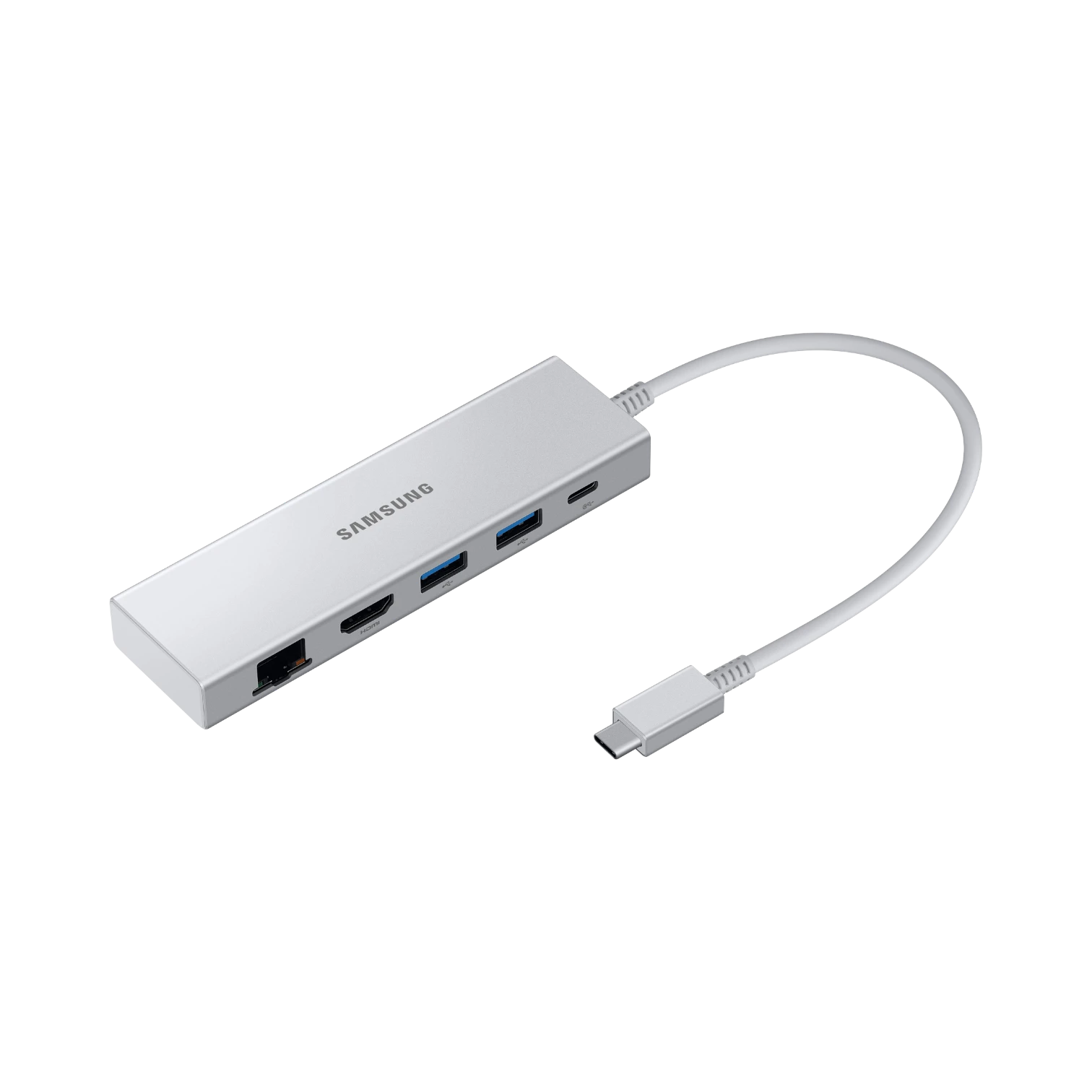 The Samsung EE-P5400USEGUS is a USB-C multiport adapter designed to expand a single USB-C port into a versatile workspace hub. It features a built-in 20 cm cable for flexible placement and a compact gray housing that fits neatly on your desk or in a laptop bag. This adapter supports power delivery up to 100 W and data transfer speeds up to 5 Gbps, making it a practical solution for connecting multiple devices and peripherals.