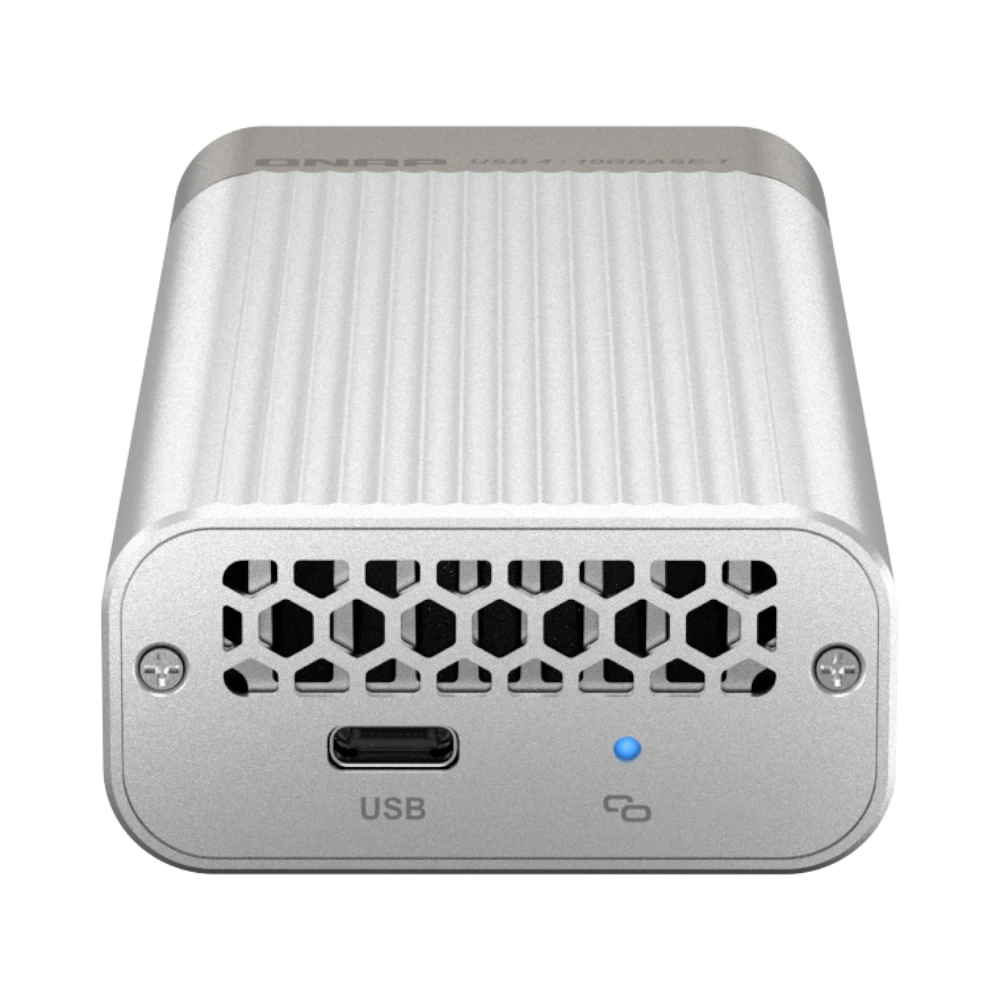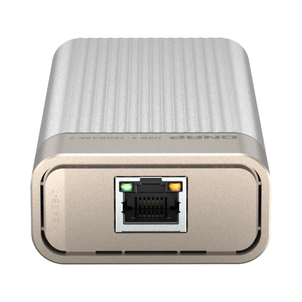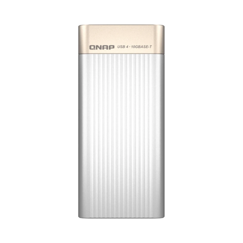 The QNAP QNA-UC10G1T is a network adapter designed to provide a 10 Gb/s wired Ethernet connection through a USB4 or Thunderbolt 3 or 4 port. It enables significantly faster data transfer speeds—up to ten times faster than standard Gigabit Ethernet—without requiring internal hardware upgrades. Its compact, fanless design makes it ideal for quiet environments and portable setups, while supporting multiple Ethernet speeds to fit various network configurations.
