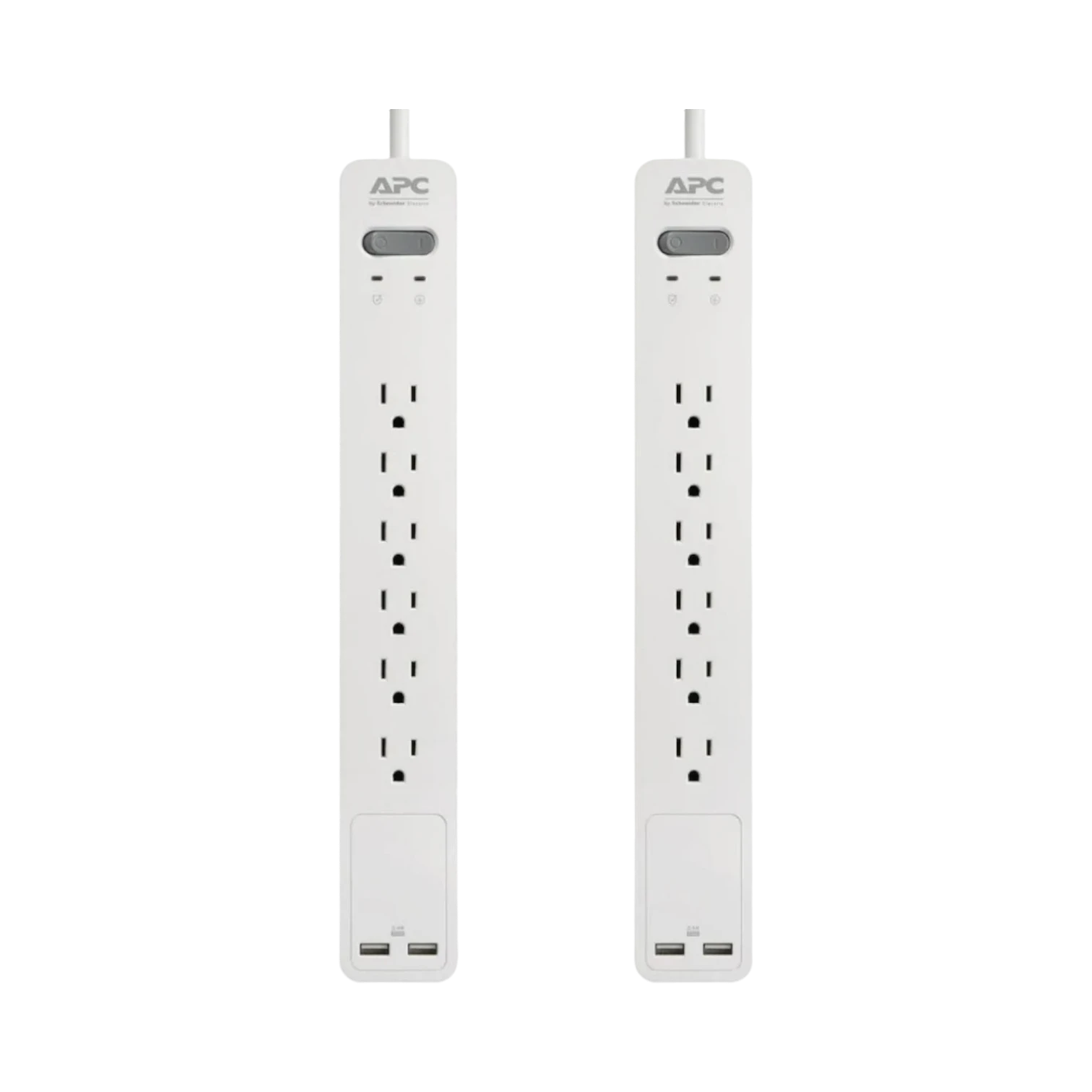 The APC PE64U2WGDP is a surge protector designed to safeguard your electronics from voltage spikes while providing convenient charging options. Each unit features six NEMA 5-15R outlets suitable for computers, televisions, small appliances, and networking gear powered by a standard 120-volt circuit. With a surge energy rating of 1080 joules, it offers reliable protection against power surges caused by storms or electrical fluctuations. Additionally, two USB Type-A ports, including one with Smart Charging technology delivering up to 2.4 amps, allow you to charge phones, tablets, and wireless headphones without sacrificing outlet space.