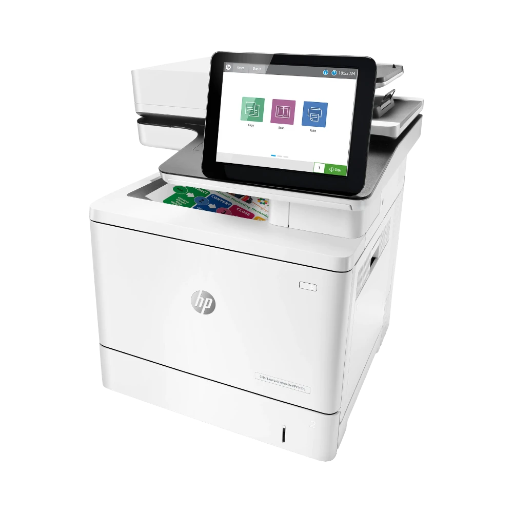 The HP 7ZU85A#BGJ is a color laser multifunction printer designed to meet the needs of busy office environments. It delivers fast printing speeds of up to 40 pages per minute in both black and color, with a first page out time under 8 seconds, ensuring quick turnaround for reports, presentations, and envelopes. The built-in scanner features a 100-sheet automatic document feeder capable of duplex scanning, which accelerates large scanning tasks. With two standard paper trays holding 650 sheets total and the option to add up to three more trays, this printer reduces interruptions for paper refills. Its 8-inch color touchscreen simplifies job management directly at the device, while connectivity options include Ethernet and USB, with optional wireless support for flexible placement and mobile printing.