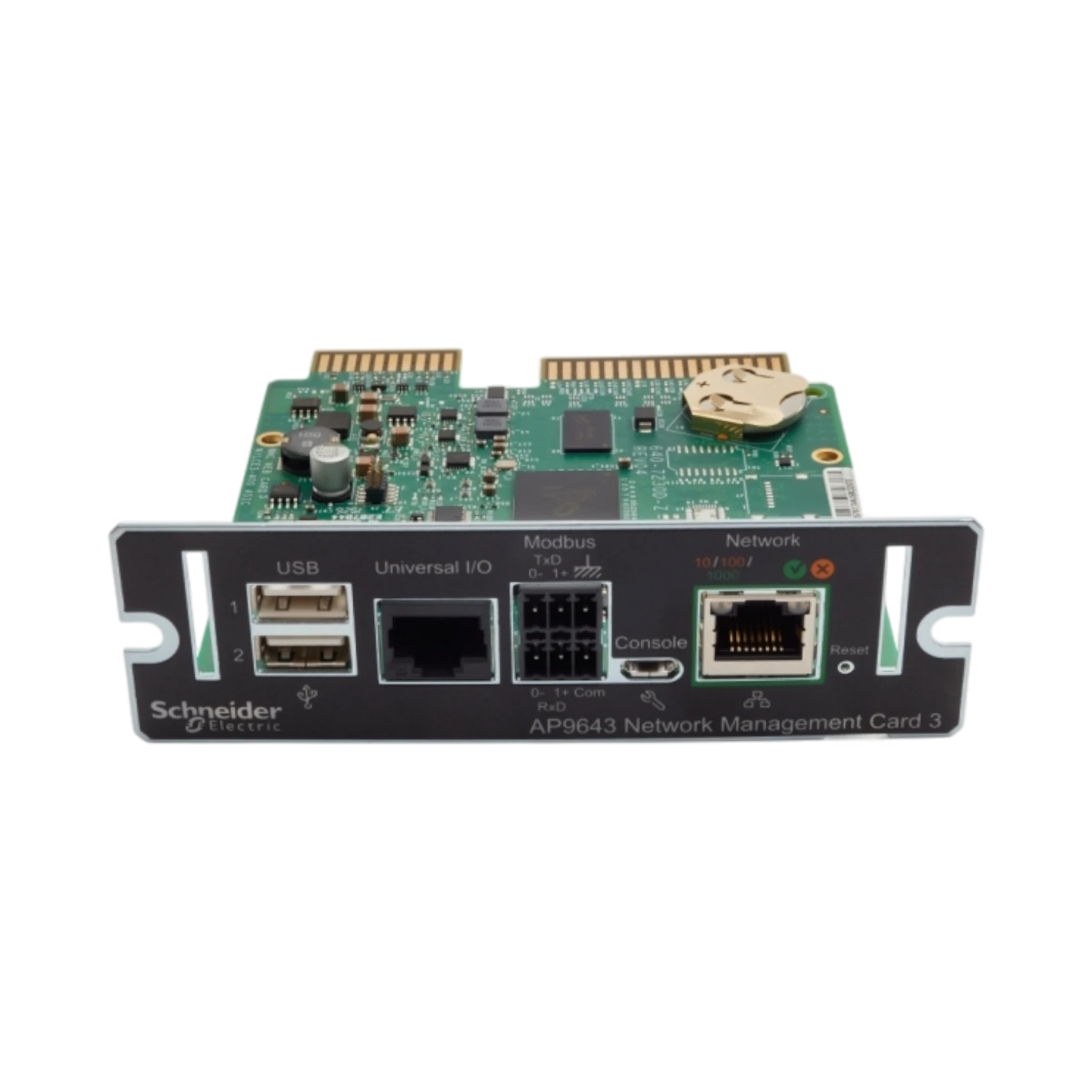 The APC AP9643 is a network management card designed to enhance Smart-UPS and Symmetra single-phase UPS units by enabling remote monitoring and control. It allows IT teams to access real-time status, perform self-tests, and execute graceful shutdowns via web browser, SNMP, or Modbus TCP/IP. This card supports integration with building management systems and data center monitoring platforms, making it a practical solution for managing power infrastructure across multiple sites.