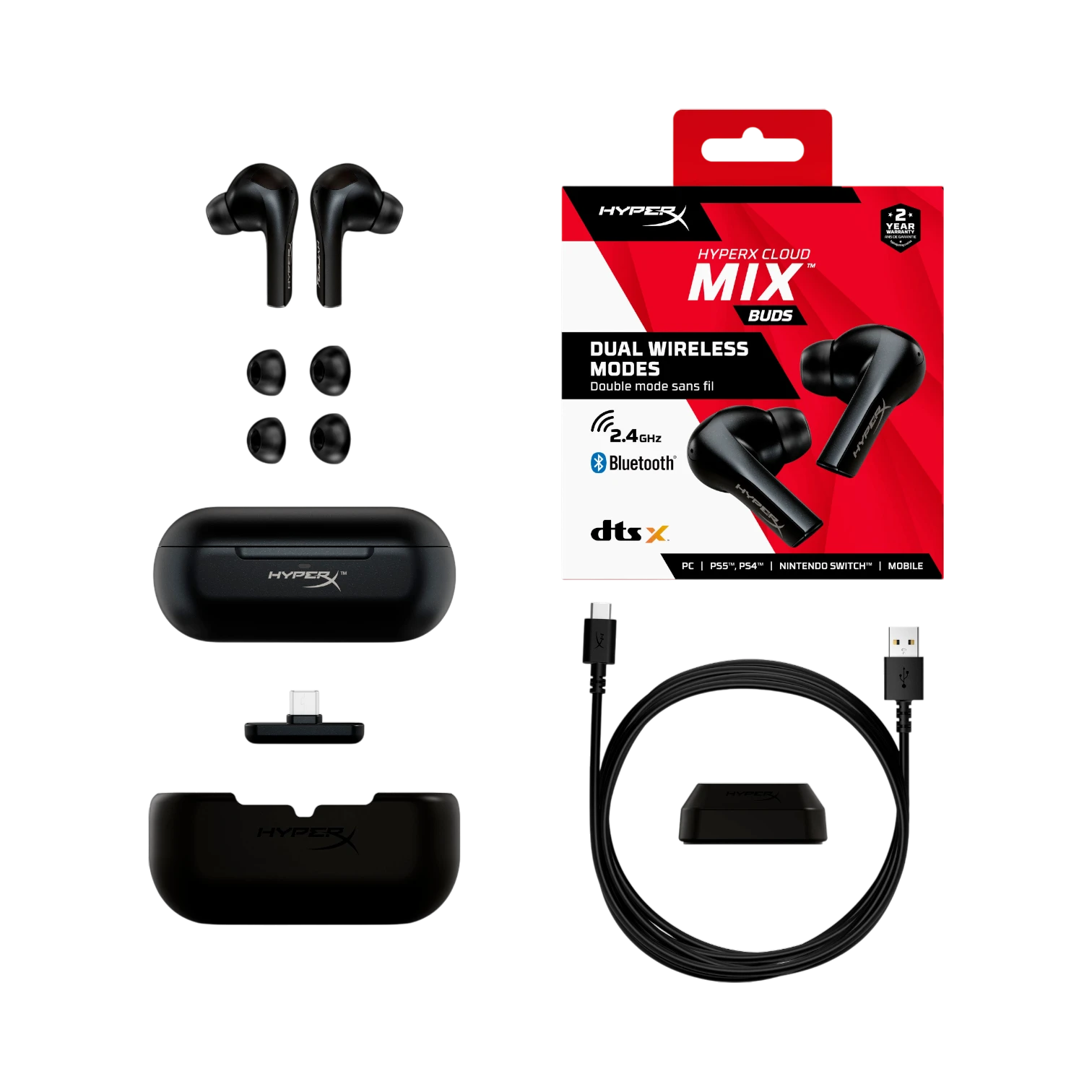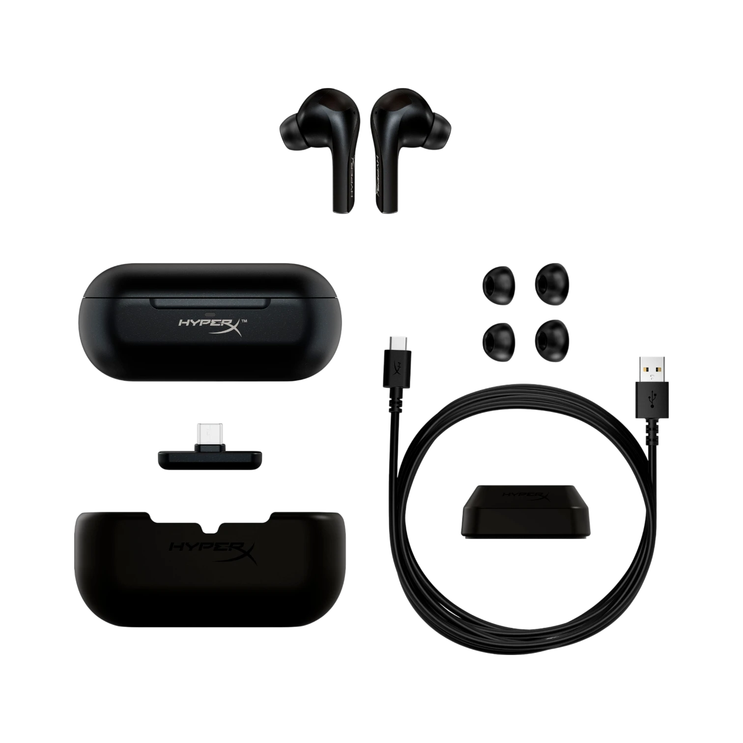- Included accessories: USB-C wireless adapter with passthrough extender, three sizes of silicone ear tips
