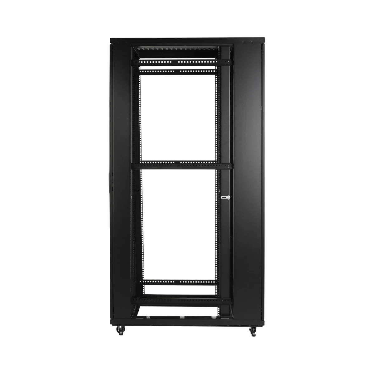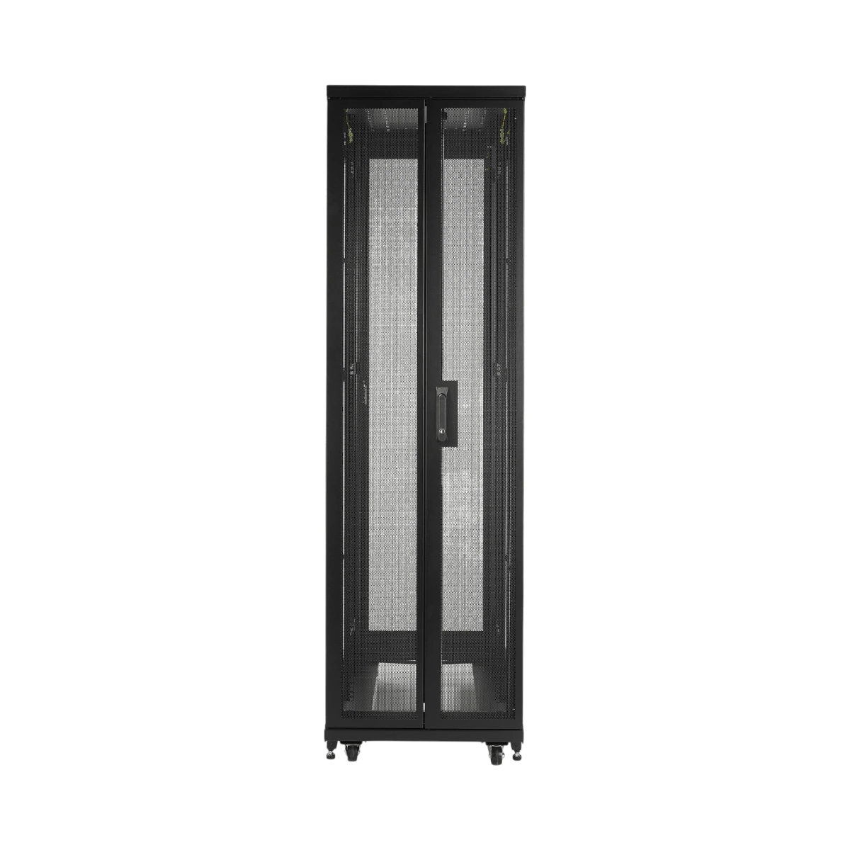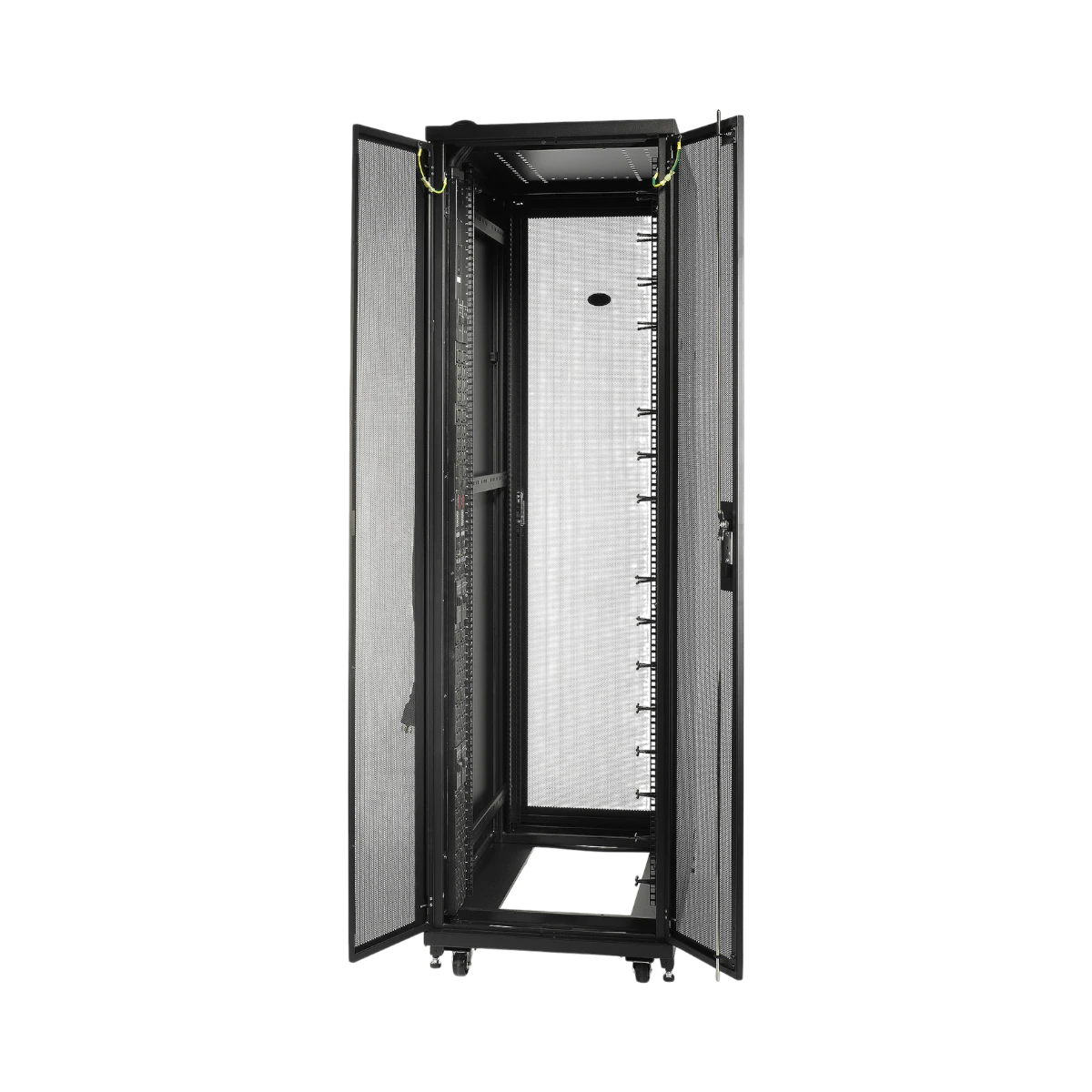 The enclosure comes ready with pre-installed casters, allowing you to easily roll it into position before securing it with leveling feet and bolt-down brackets. Baying hardware is included to link multiple units together, creating a clean and uniform row that supports efficient cable management and airflow. This setup flexibility makes it straightforward to expand your data center as your equipment needs grow.