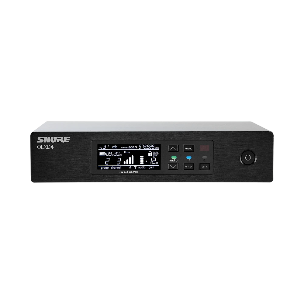 The Shure QLXD4=-H50 is a UHF digital wireless receiver designed for the H50 frequency band spanning 534 to 598 MHz. It delivers high-quality wireless audio with 24-bit, 48 kHz digital transmission and latency under 2.9 ms, making it ideal for vocalists, presenters, and instrumentalists who require real-time monitoring. Its half-rack format and straightforward controls simplify setup and operation in environments where multiple channels and reliable performance are essential.