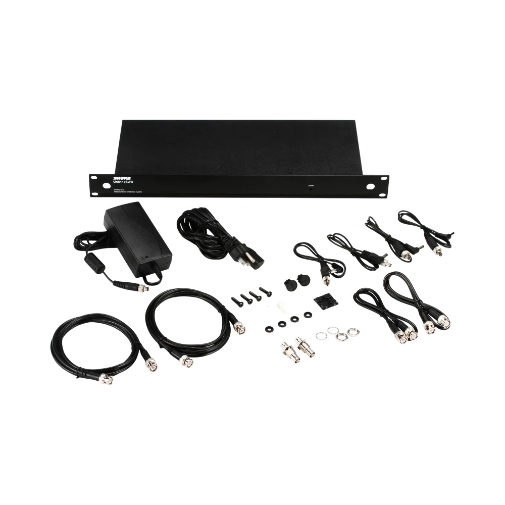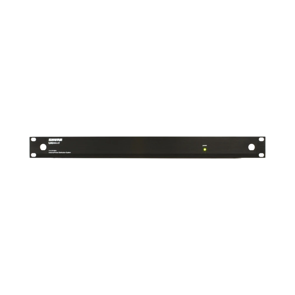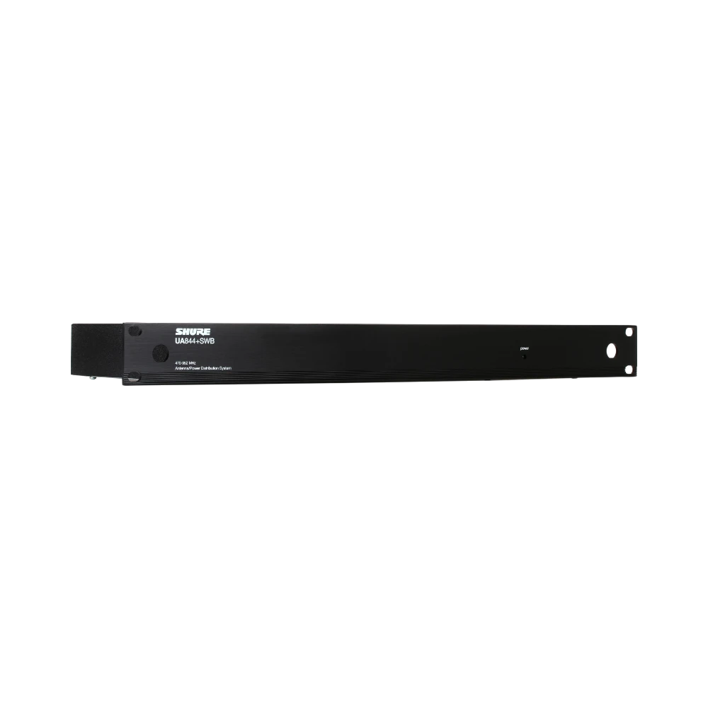 The Shure UA844+SWB is a UHF wideband antenna distribution system designed to extend and simplify wireless microphone setups by sharing a single pair of remote antennas across up to five Shure wireless receivers. Covering a broad frequency range from 470 to 960 MHz, it ensures compatibility with multiple Shure receiver models while maintaining consistent signal strength through its built-in RF amplifier with adjustable gain from -1 to +1 dB. This system is ideal for professional audio environments where clean, reliable RF distribution is essential.