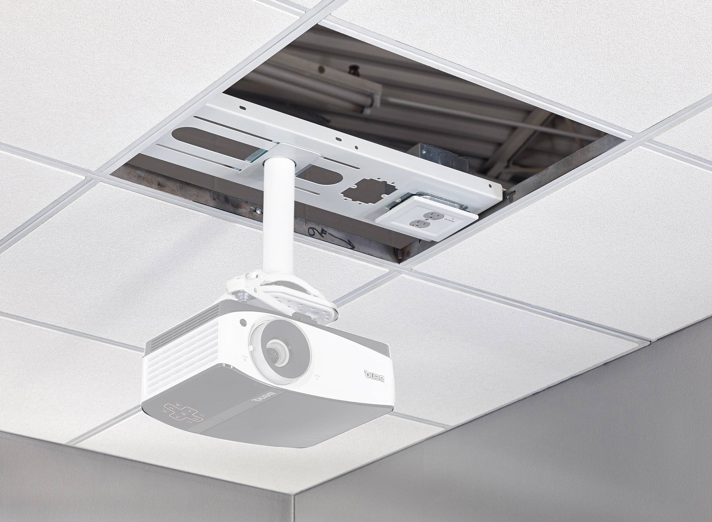 Its dual gang electrical housing features SurgeX multi-stage filtration, which protects sensitive electronics from power spikes and line noise without limiting current flow. The kit fits common 600 x 600 mm and 600 x 1200 mm ceiling grids found in classrooms, meeting rooms, and hospitality venues across Europe, Canada, and Mexico.
