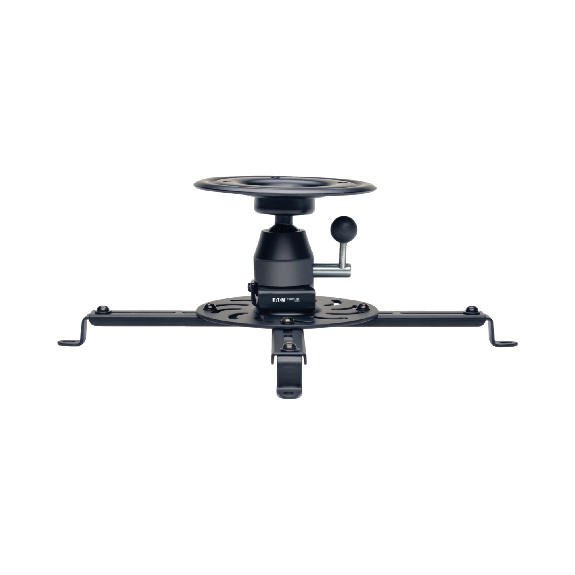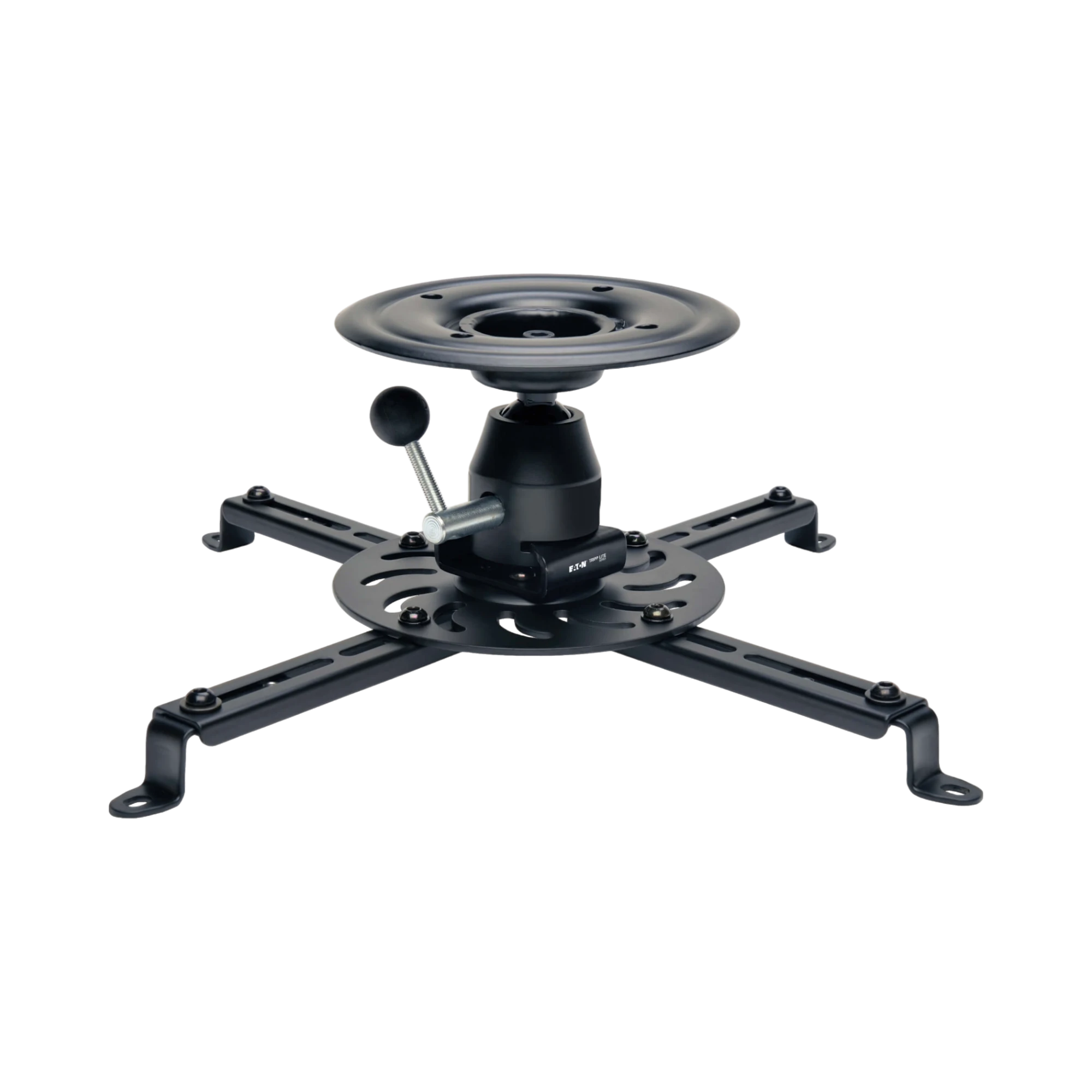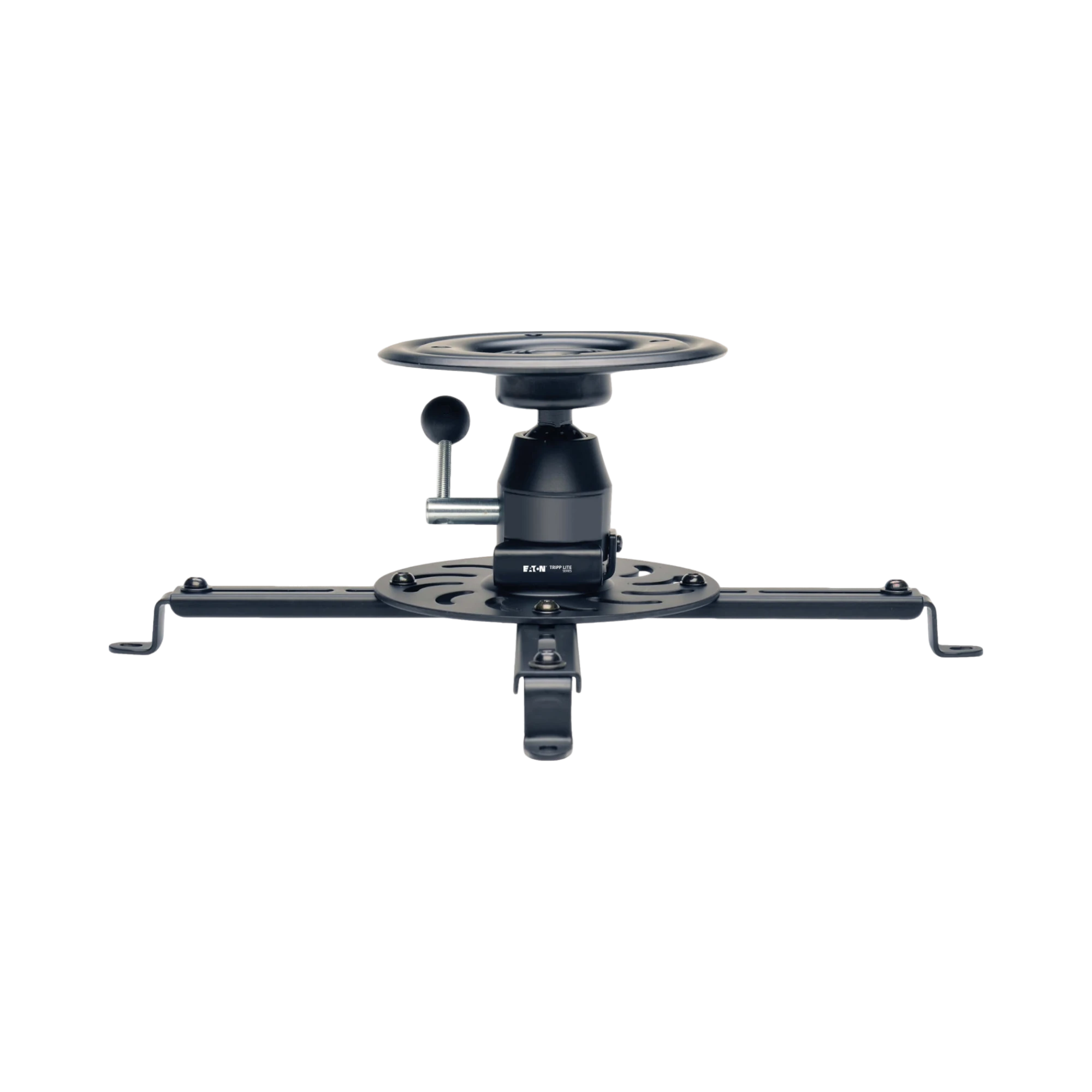 The Tripp Lite DUNVPJT is a full motion universal projector ceiling mount designed to securely suspend your digital projector overhead, saving valuable floor and wall space. It supports projectors weighing up to 55 lbs (24.9 kg) and offers precise alignment control with a full 360-degree swivel and tilt range from minus 20 to plus 20 degrees. This mount is ideal for classrooms, conference rooms, home theaters, and other spaces where flexible projector positioning is essential.