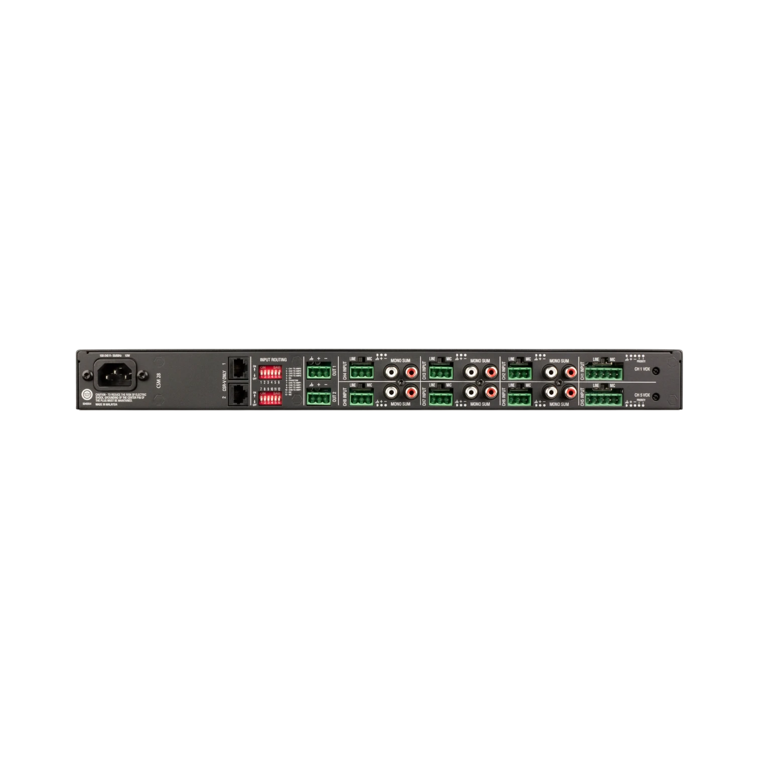 The JBL NCSM28-U-US is a commercial audio mixer designed to manage multiple audio sources with ease, featuring eight inputs and two outputs in a compact 1U rack-mountable unit. It serves venues like restaurants, retail stores, fitness studios, and schools by providing clear announcements and consistent background music. The mixer includes separate bass and treble controls for each output, allowing precise sound tuning to suit different room acoustics, and operates silently thanks to its fan-free design.