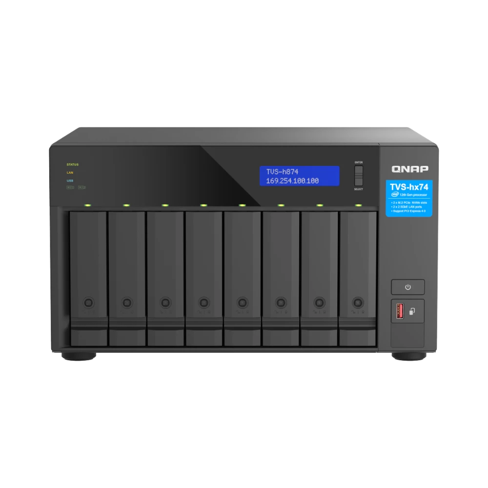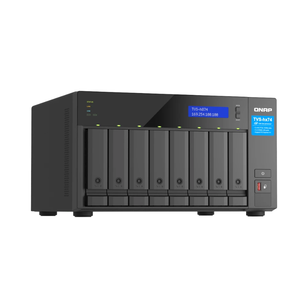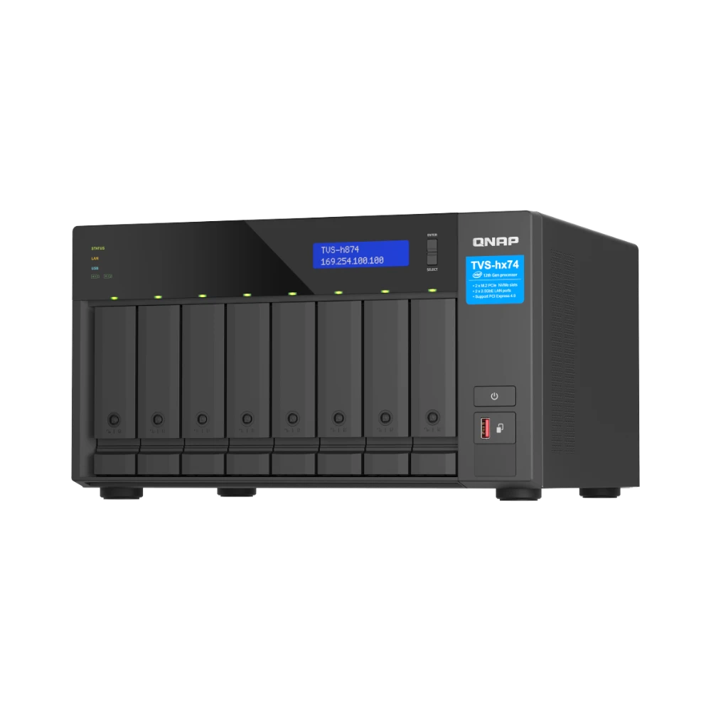 The QNAP TVS-H874-I7-32G-US is an 8-bay network attached storage enclosure designed to deliver high performance and robust data protection for creative studios, small and midsize businesses, and home lab enthusiasts. Powered by a 12th Generation Intel Core i7 processor with 12 cores and equipped with 32 GB of DDR4 memory, this NAS supports demanding multi-user workflows involving large files such as 4K video editing and virtual machine storage. Its flexible storage options and advanced QuTS hero operating system ensure data integrity and efficient management.