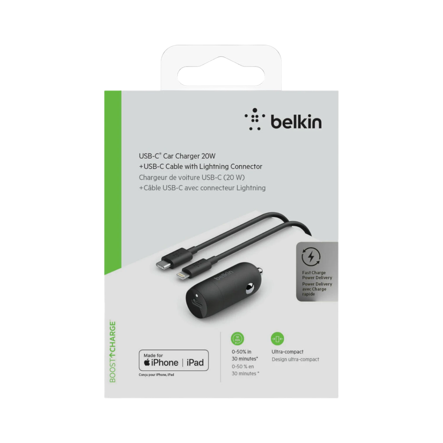 The Belkin CCA003BT04BK is a 20 watt USB-C car charger designed to quickly recharge your iPhone or iPad while you drive. It connects to any standard 12 volt car outlet and uses USB Power Delivery to charge compatible devices efficiently, reaching about 50 percent battery in roughly 30 minutes. This charger comes with a USB-C to Lightning cable, making it ready to use right out of the box without needing extra accessories.