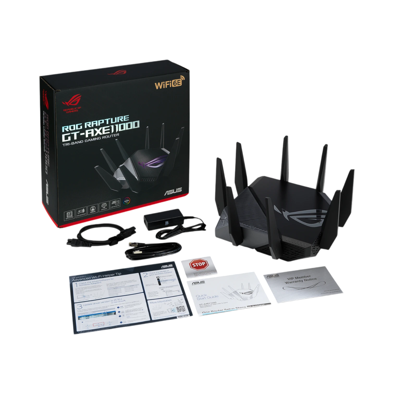 The ASUS GT-AXE11000 is a wireless tri-band gigabit gaming router designed to deliver high-speed connectivity with a focus on gaming and multimedia performance. It introduces WiFi 6E technology, opening a clear 6 GHz band alongside the traditional 2.4 GHz and 5 GHz bands, enabling combined wireless speeds of up to 11,000 Mbps. Powered by a 1.8 GHz quad-core processor, this router efficiently manages network traffic to support smooth gaming, 4K streaming, and large file transfers.