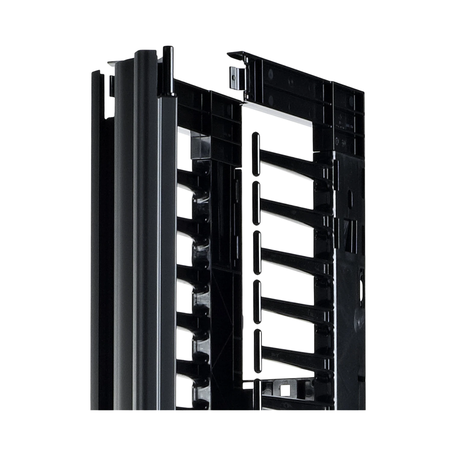 - Single-sided vertical channel with a full-height door to keep cables hidden and protected