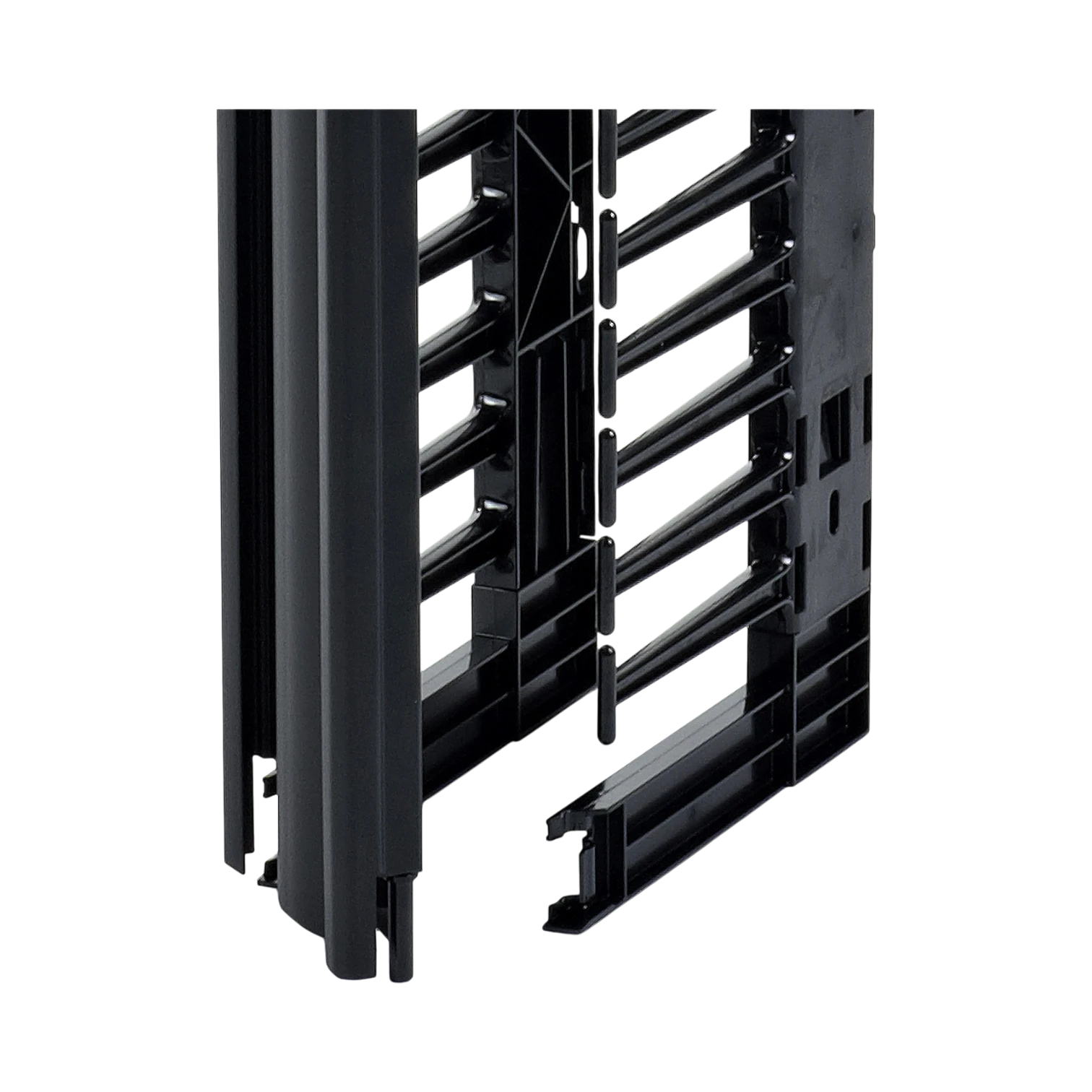 The unit features a full-height hinged door that conceals cables and prevents accidental snags during maintenance. Inside, smooth plastic fingers positioned at every 1U mark help reduce bend radius stress on patch cords, while multiple tie-off points allow precise cable securing to maintain airflow and simplify future changes.