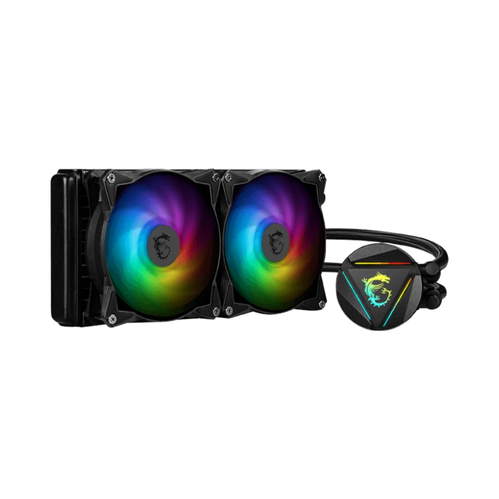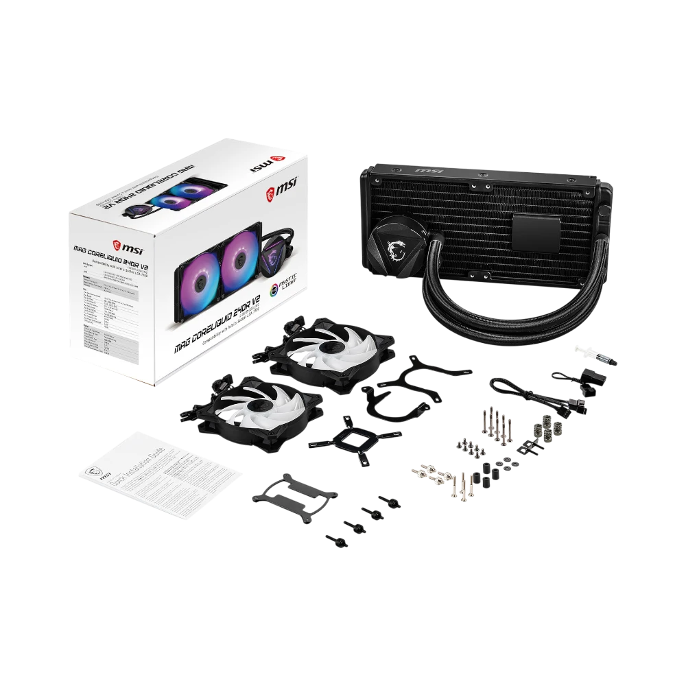 The MSI MAG CORELIQUID 240R V2 is a liquid CPU cooler designed to provide efficient thermal management for mid to high-end desktop builds. It features a 240 mm aluminum radiator combined with an integrated pump and two 120 mm PWM fans that include addressable RGB lighting. The pump operates at 4200 rpm with a three-phase motor to reduce vibration and noise, while the fans adjust between 500 and 2000 rpm to balance quiet operation and strong airflow, reaching up to 78.73 CFM.