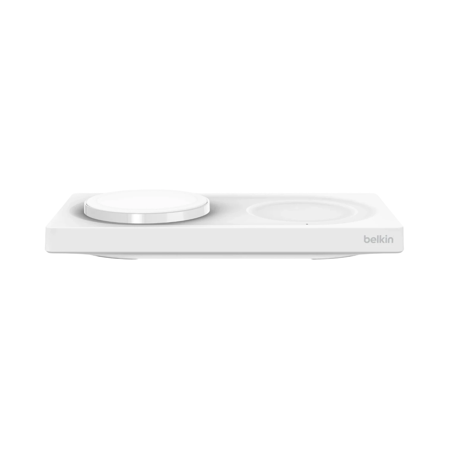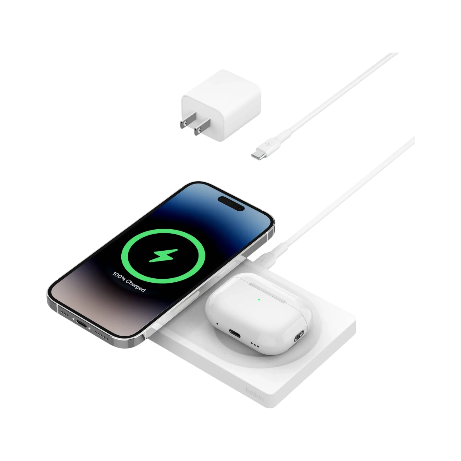 The Belkin BoostCharge Pro 2-in-1 20W Wireless Charging Pad (White) is a dual-purpose wireless charger designed to power your iPhone and AirPods simultaneously. It delivers up to 15 W of MagSafe wireless charging to compatible iPhones and up to 5 W to AirPods, all within a sleek, lay-flat design that fits comfortably on a nightstand, desk, or travel bag. This charger helps reduce cable clutter while providing a reliable and safe charging experience.
