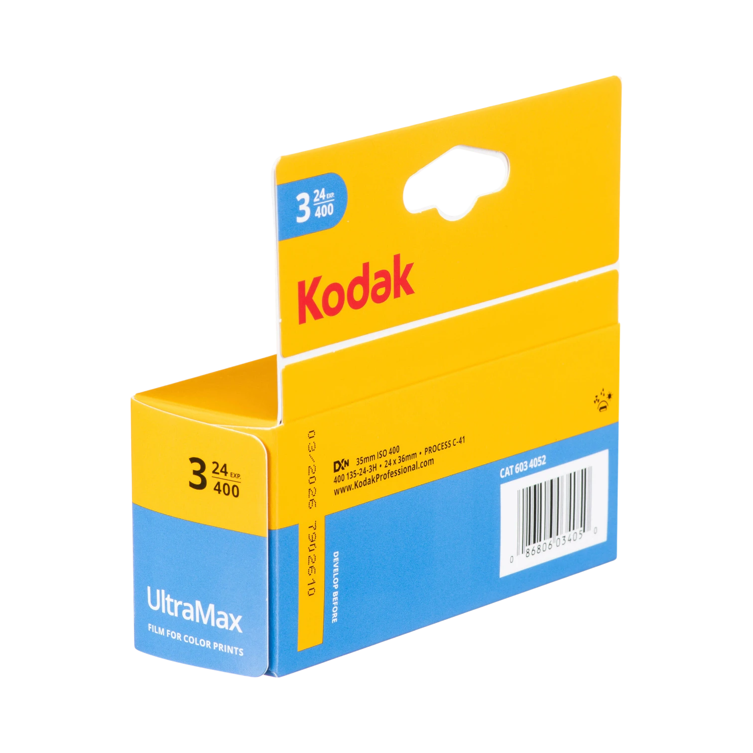 The Kodak 6034052 is a three-pack of UltraMax 400 color negative film designed for 35 mm cameras, offering ISO 400 sensitivity that adapts well to a variety of lighting conditions. This film is daylight balanced to produce natural colors and pleasing contrast, making it suitable for shooting in bright sunlight, overcast skies, or indoor environments without needing to change film or use a flash. Each roll contains 24 exposures, providing a total of 72 frames for capturing portraits, landscapes, and everyday moments with fine grain and sharp detail.