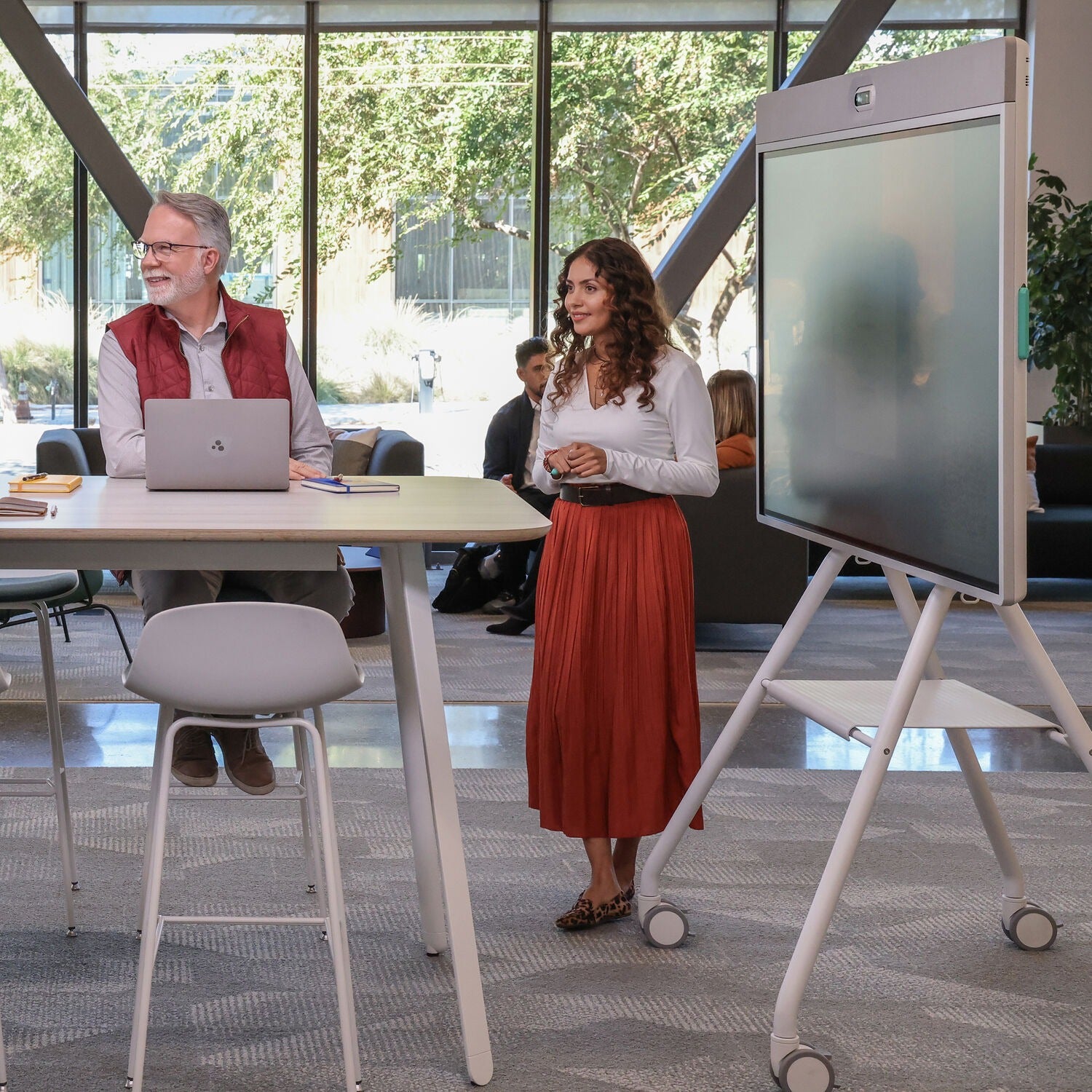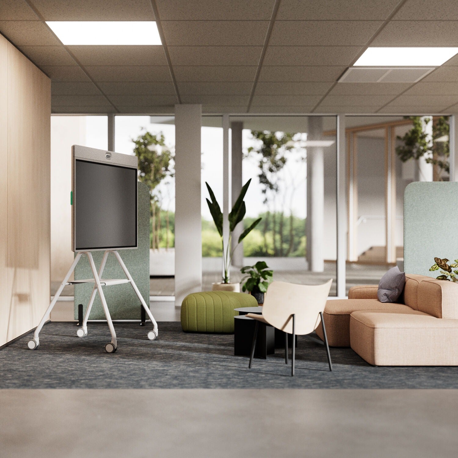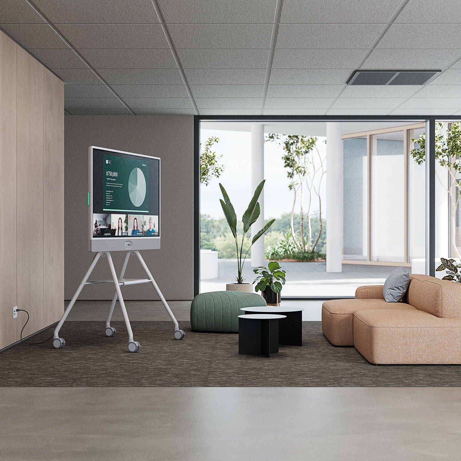 This mobile cart fits naturally in workplaces that share a Rally Board 65 across multiple rooms or areas. It works well in meeting rooms, open collaboration zones, project rooms, and training environments where layouts change frequently. Teams can quickly reconfigure spaces without the need for wall mounting, and presenters can bring the board directly to their audience for more engaging sessions.