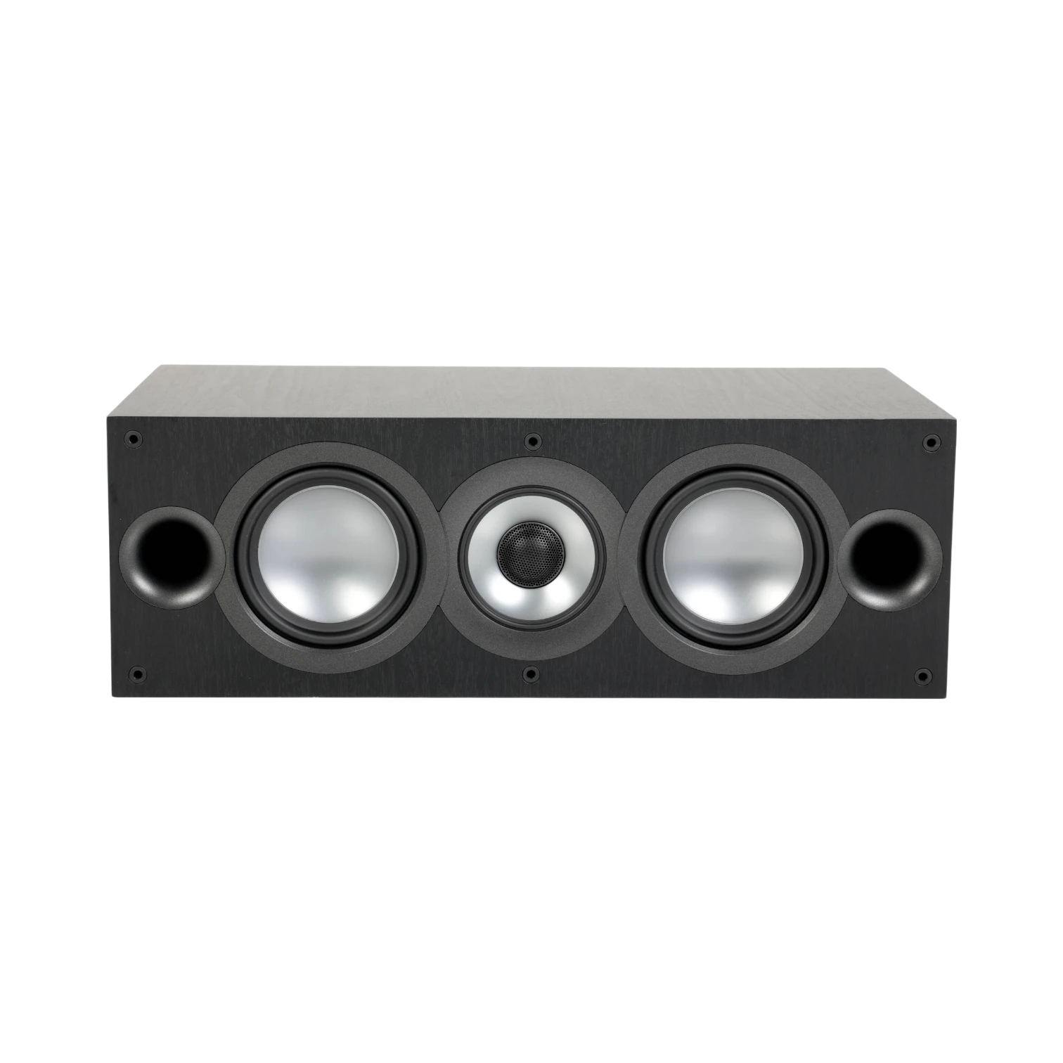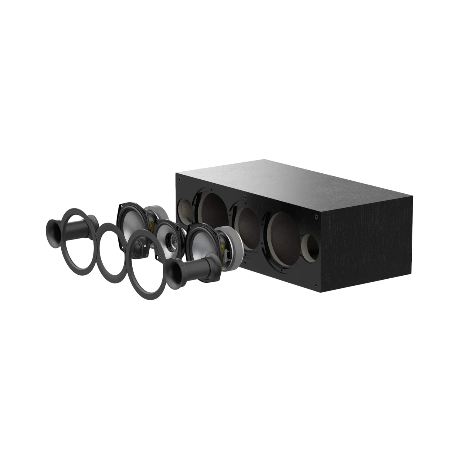 The ELAC UC52-BK is a three-way center channel speaker designed to deliver clear and precise dialogue for home theater setups. It features a concentric driver with a 1 inch soft-dome tweeter positioned at the center of a 4 inch aluminum midrange cone, ensuring phase alignment and consistent vocal clarity across a wide listening area. Two 5.25 inch aluminum woofers provide controlled bass, while front-firing ports enhance low-end response without requiring extra space behind the cabinet. With a frequency response spanning 48 Hz to 35 kHz, this speaker captures everything from deep voices to detailed soundtrack effects, making it a strong choice for movie lovers, gamers, and music enthusiasts alike.