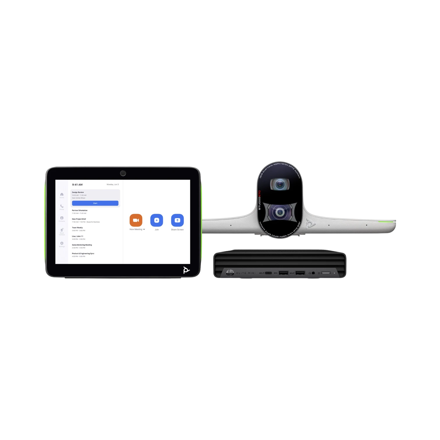 The Poly 9D9Q9AA is a comprehensive hardware bundle designed to equip large meeting rooms for Zoom Rooms on Windows. It combines a powerful HP Mini Conferencing PC with an Intel Core i7 processor, 16 GB of memory, and a 256 GB solid state drive to ensure smooth video calls and fast content sharing. The Poly Studio E70 camera delivers true 4K video with dual 20 MP sensors and AI-driven speaker tracking, while the Poly TC10 controller offers a 10.1 inch touchscreen for easy meeting control. This setup supports seamless collaboration whether participants are in the room or remote.