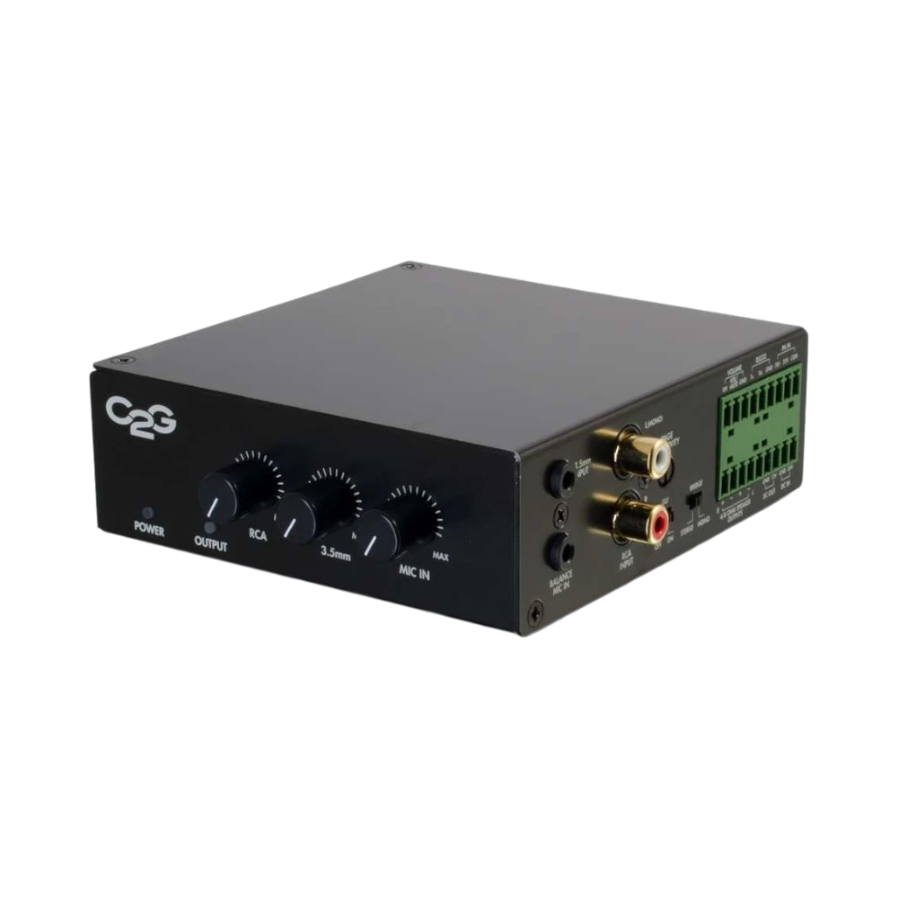 The C2G 40880 is an 8 Ohm audio amplifier designed to deliver a total of 50 Watts of power, with 25 Watts directed to each stereo channel. Its plenum-rated housing allows safe installation above drop ceilings or within air-handling spaces, meeting strict building codes. The compact size, measuring just over four and a half inches wide, makes it easy to fit behind displays or inside lecterns without taking up much space.