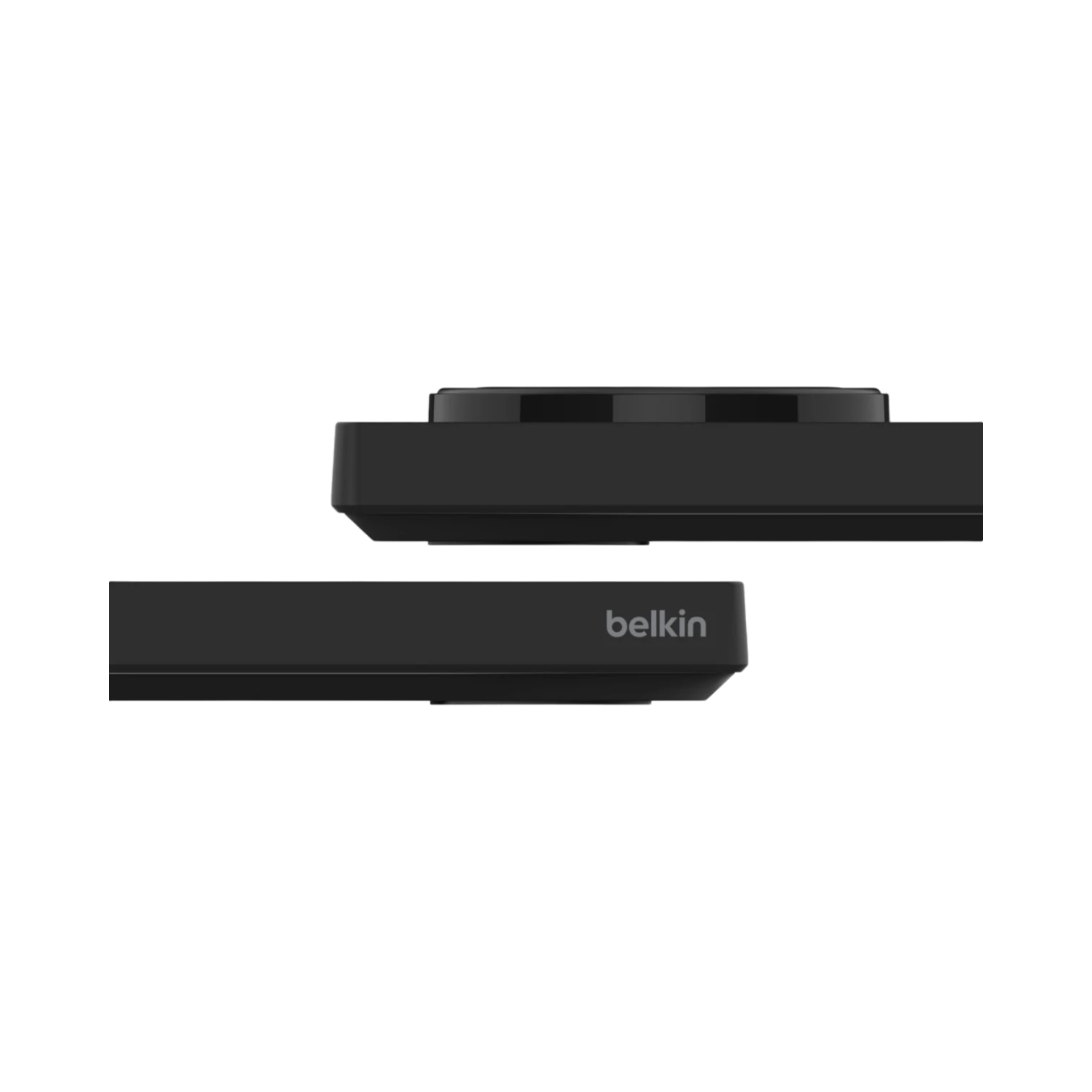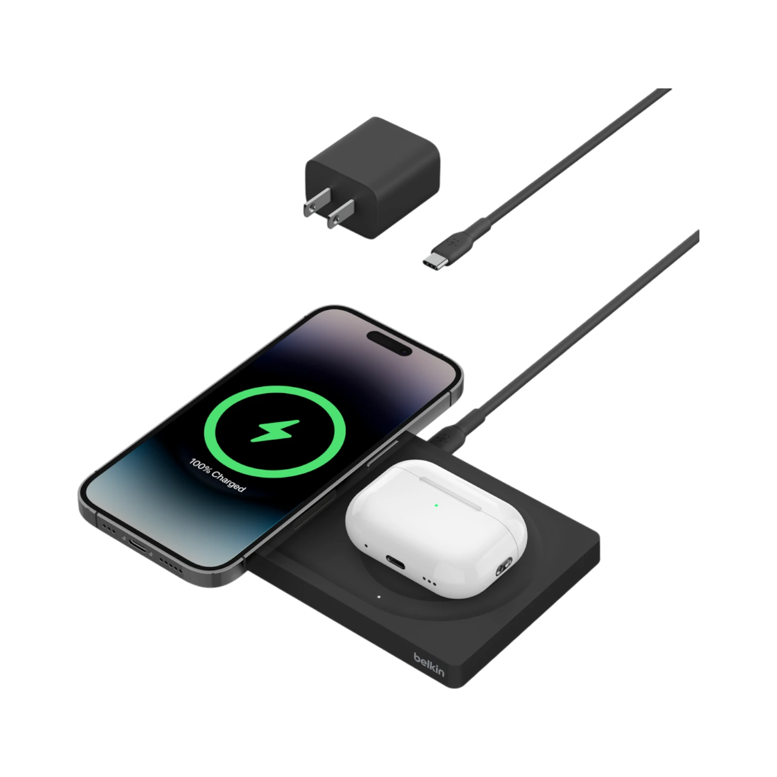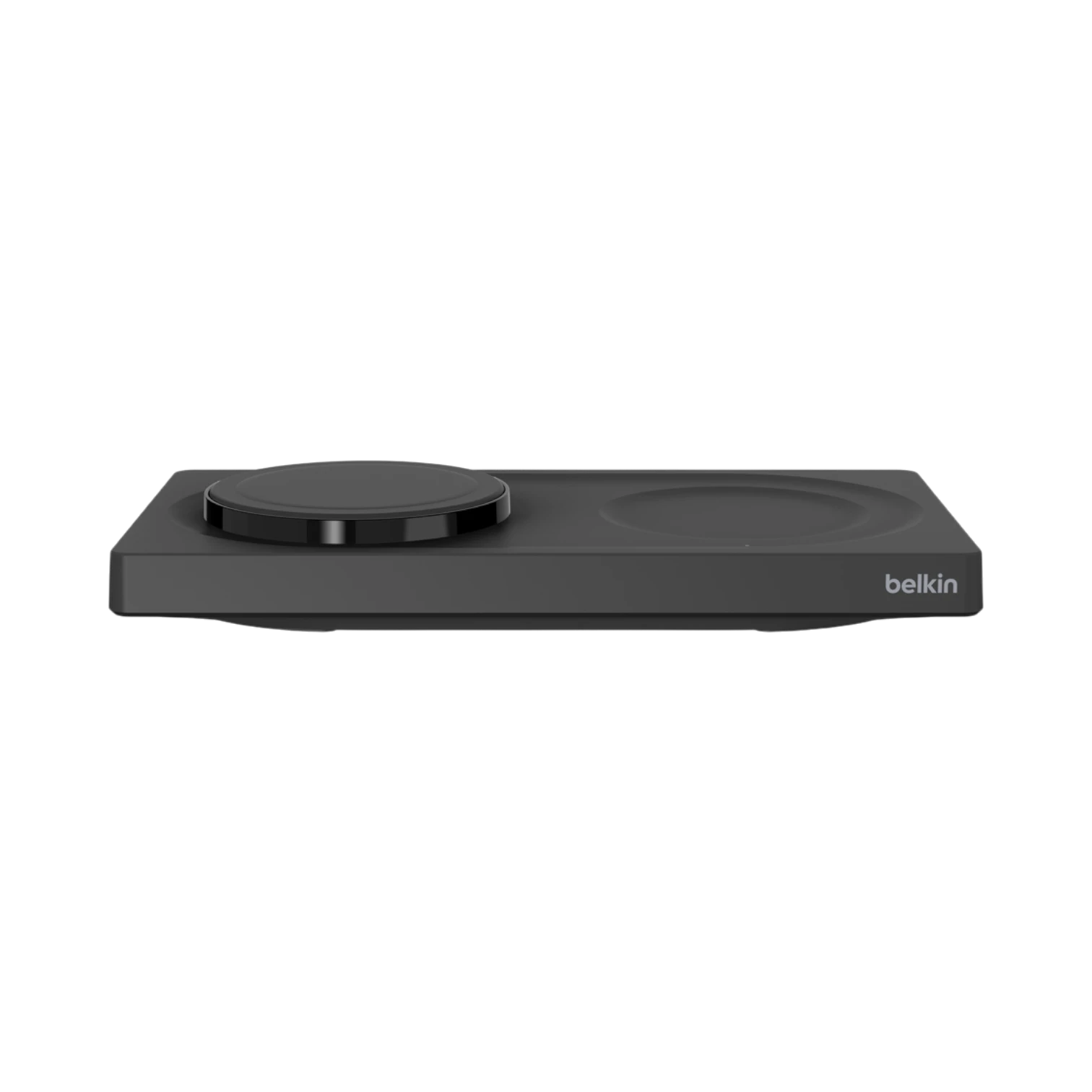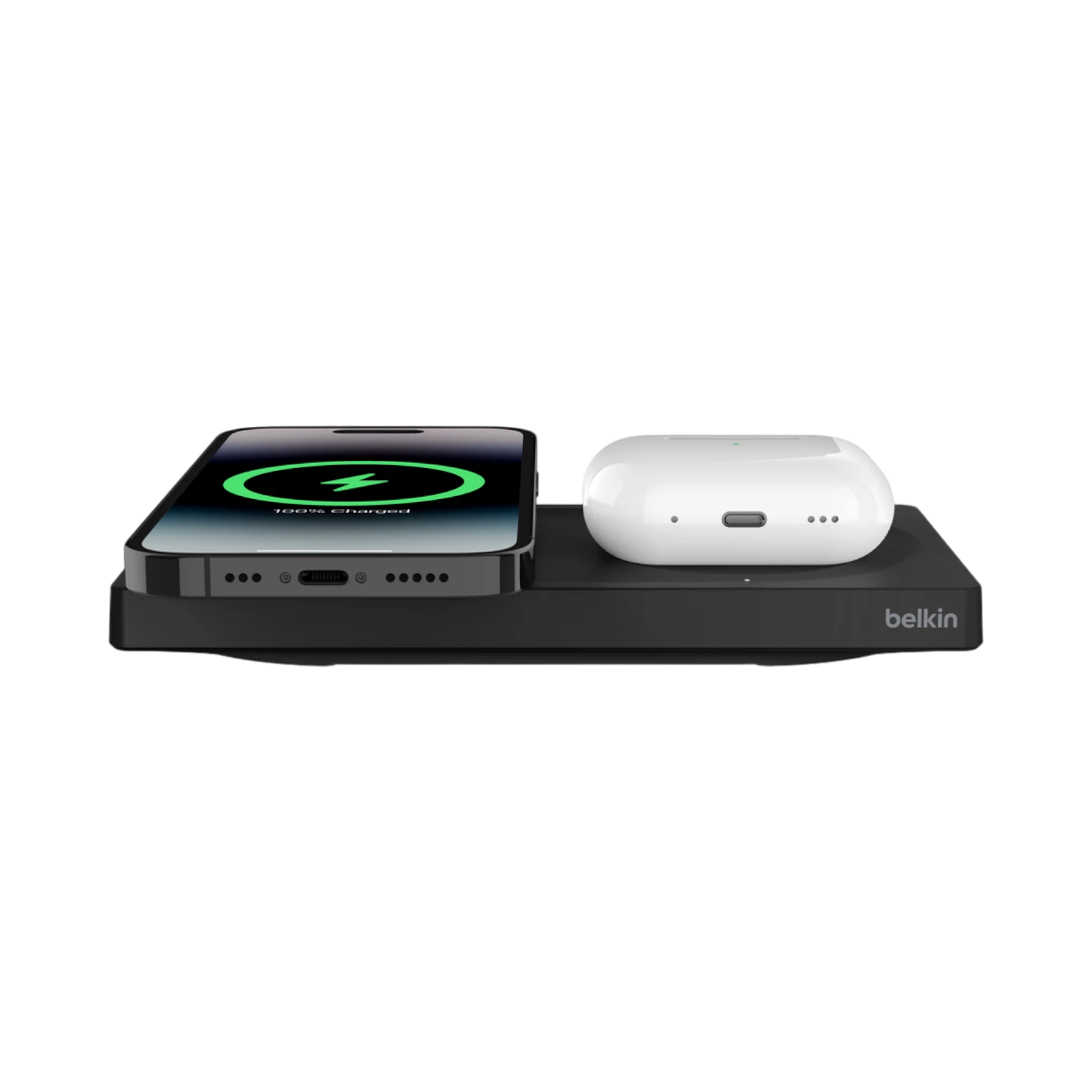 The Belkin WIZ019TTBK is a 2-in-1 wireless charging pad designed to power your iPhone and AirPods simultaneously on a single, organized surface. It delivers up to 15 W of MagSafe wireless charging for iPhones and up to 5 W for AirPods placed in the recessed charging area. Its slim, lay-flat design in black fits seamlessly on nightstands, desks, or travel bags, making it a practical choice for both home and on-the-go use.