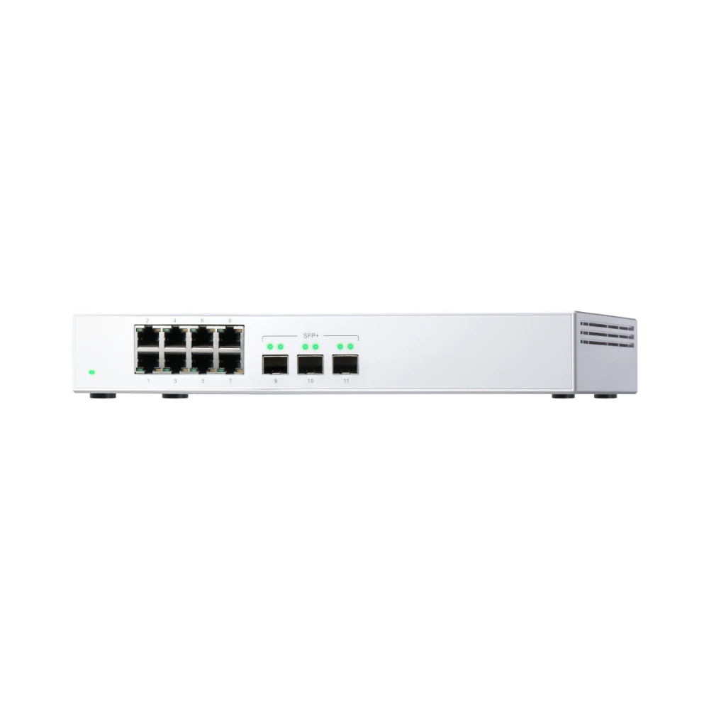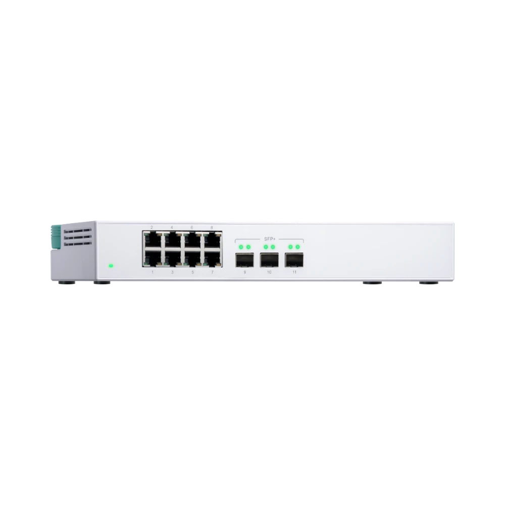 The QNAP QSW-308S-US is an unmanaged desktop network switch designed to provide a seamless mix of eight Gigabit Ethernet ports and three 10 GbE SFP+ ports. It serves small offices, creative studios, and demanding home setups by enabling easy connectivity for workstations, NAS devices, printers, and access points, while reserving high-speed links for servers or aggregation switches. With a switching capacity of 76 Gb/s and non-blocking throughput of 38 Gb/s, it ensures smooth data flow even during heavy file transfers.