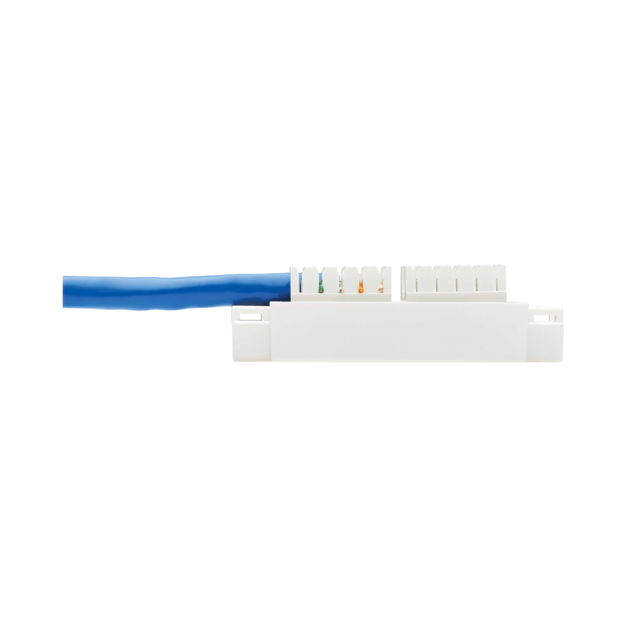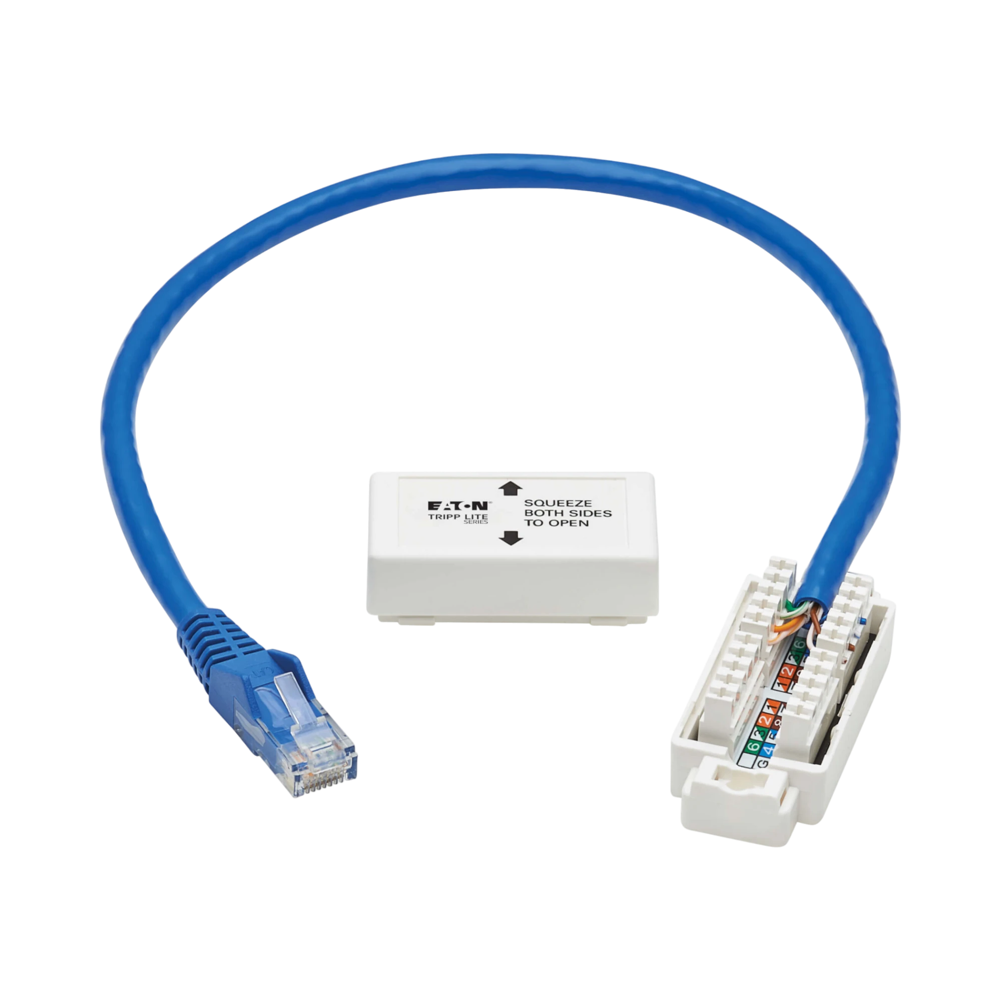 The Tripp Lite N237A-F18N-WHSH is a shielded Cat6a keystone jack cable assembly designed to deliver both data and power in challenging installation environments. With an 18-inch length, it connects a female RJ45 keystone jack directly to a male RJ45 plug, making it ideal for tight spaces like open ceilings, raised floors, or equipment enclosures. Supporting network speeds up to 10 Gbps and PoE power delivery up to 100 watts, this cable assembly ensures reliable performance for devices such as IP cameras, wireless access points, and LED fixtures.