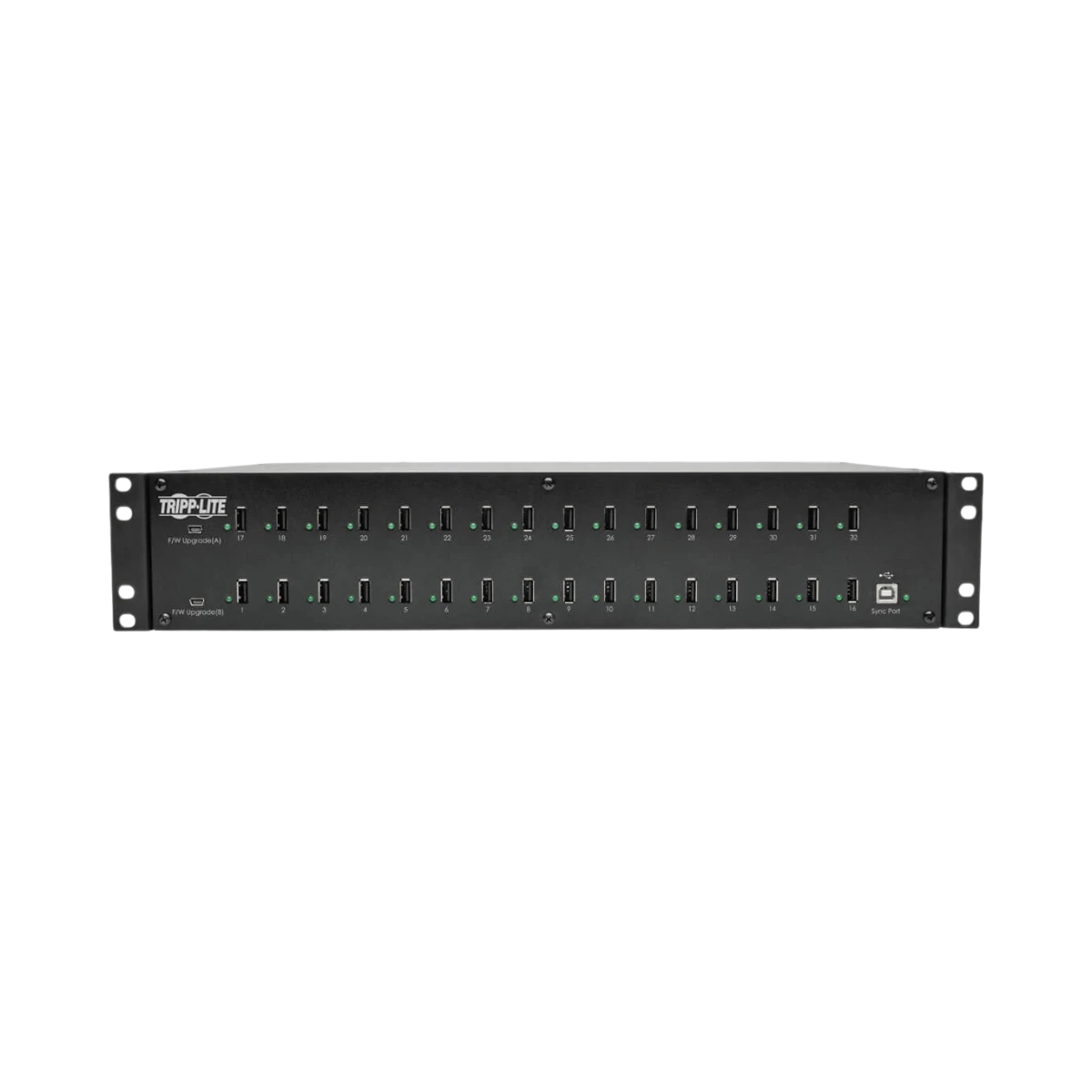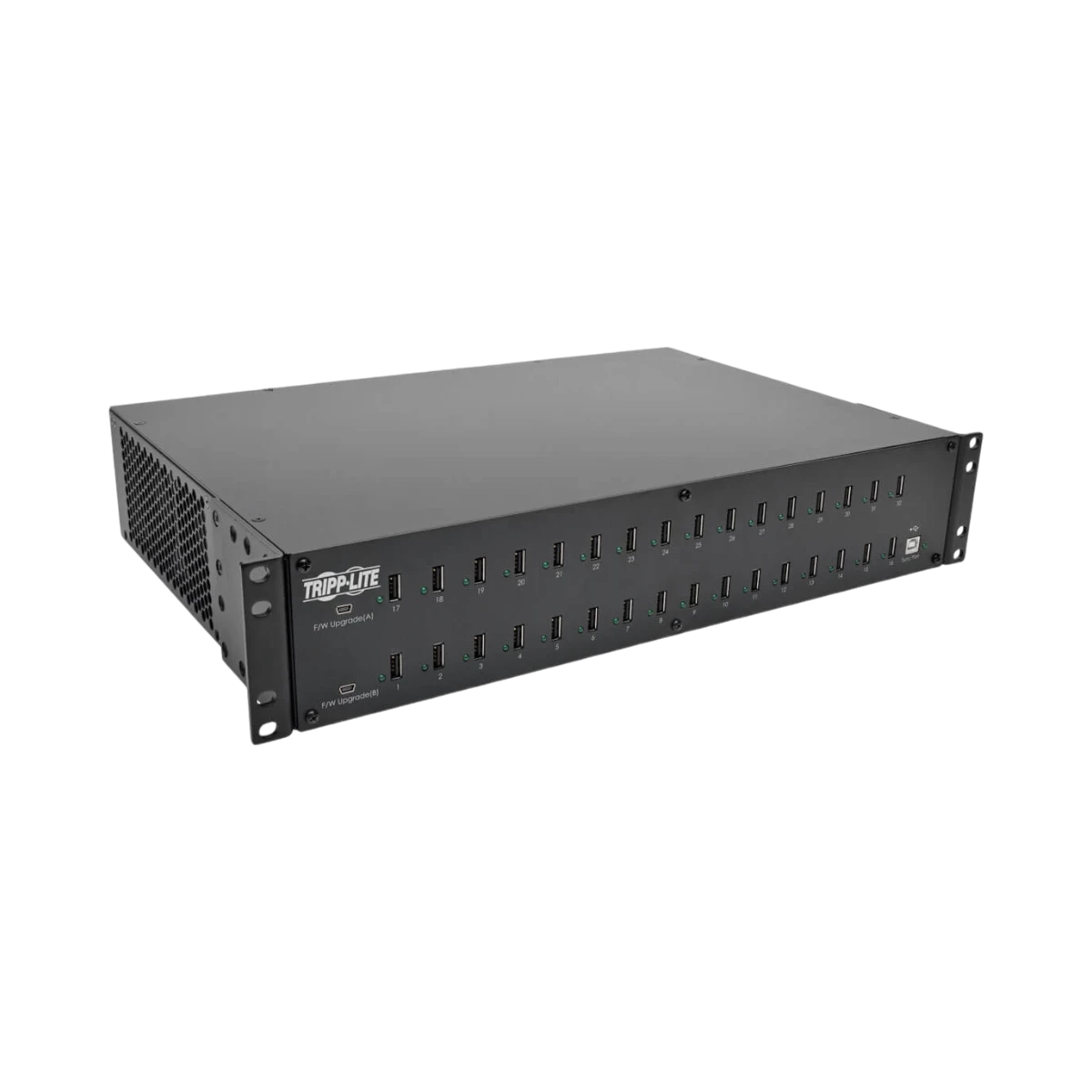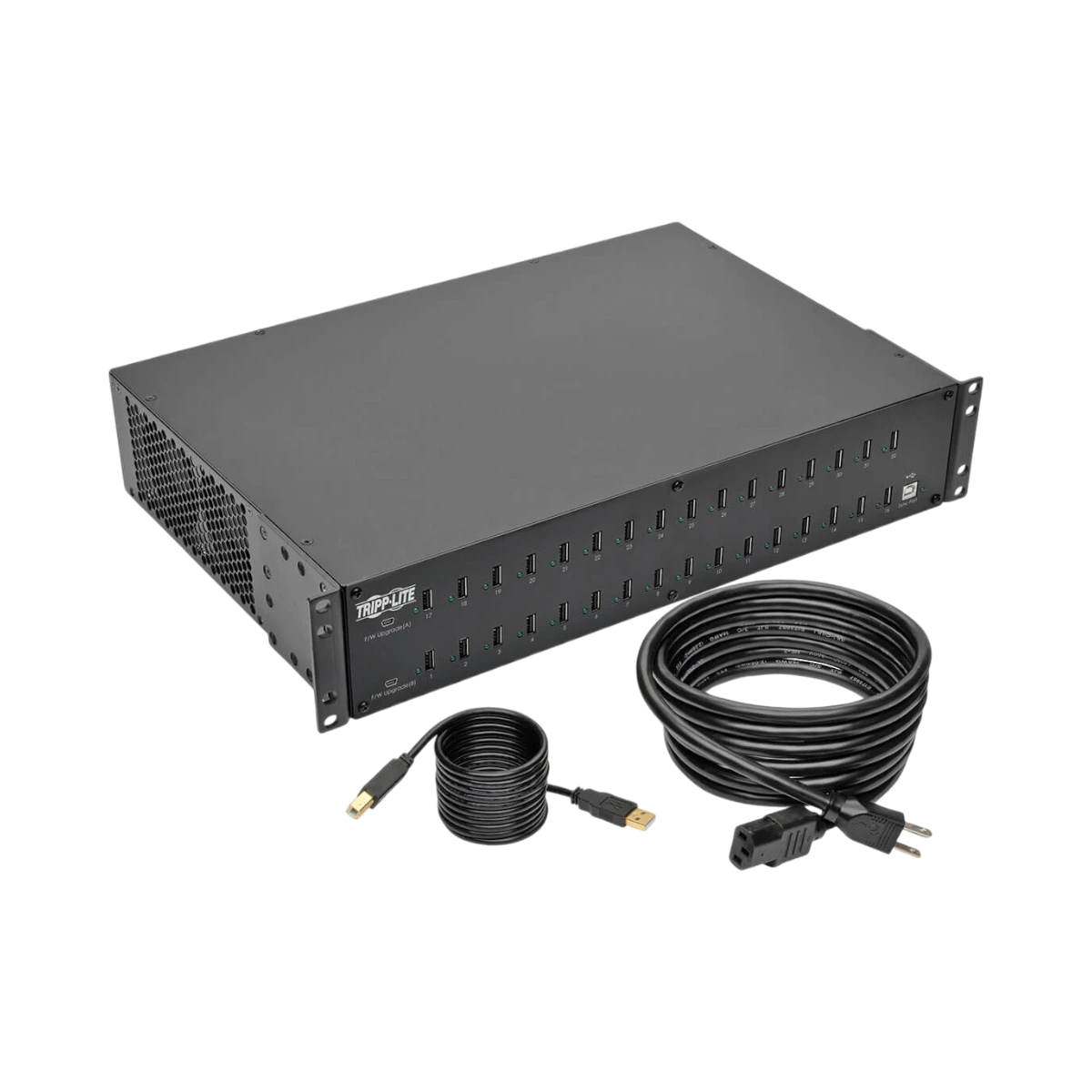 The Tripp Lite U280-032-RM is a 32-port USB charging and syncing station designed to efficiently manage multiple mobile devices simultaneously. It delivers a total output of 80 A (400 W), with each port providing up to 2.4 A for fast charging of tablets, smartphones, barcode scanners, and other USB-powered devices. This rack-mount unit fits into 2U of standard 19-inch rack space, making it a practical solution for classrooms, retail counters, IT labs, and other environments where many devices need to be charged and updated at once.