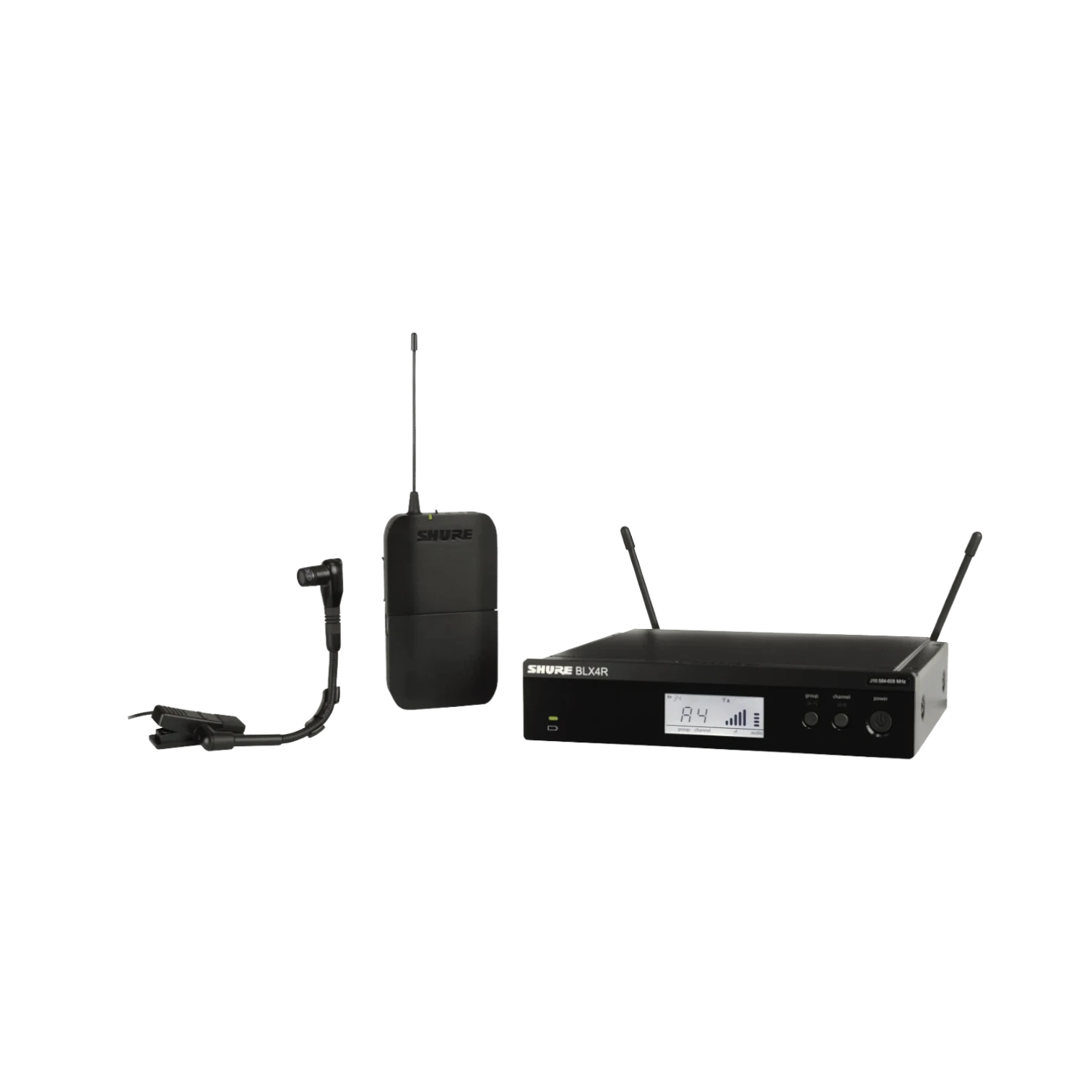 The Shure BLX14R/B98-J11 is a wireless instrument microphone system designed to deliver clear and reliable sound for brass, woodwind, and percussion players. It combines the BLX4R rackmount receiver with the BETA 98H/C clip-on cardioid condenser microphone, allowing musicians to perform without the restrictions of cables. With an operating range of up to 300 feet and a transmitter battery life of up to 14 hours, this system supports dynamic stage movement and extended performances.