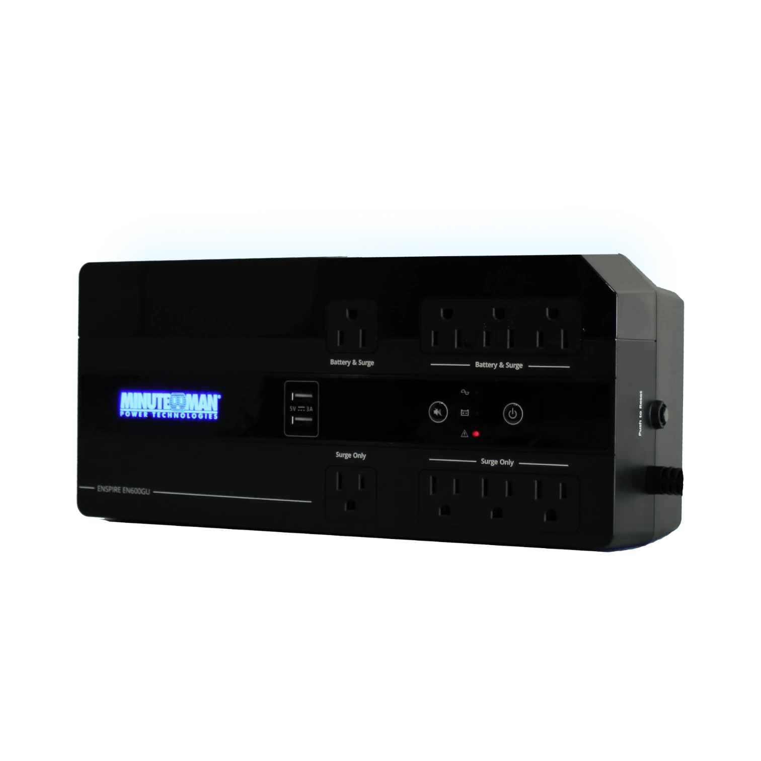 The Minuteman UPS EN600GU is a standby uninterruptible power supply designed to protect essential electronics such as computers, home-office routers, and game consoles from power interruptions. With a capacity of 600 volt-amps and 300 watts, it switches instantly to battery power during outages, allowing you to save work and shut down devices safely. This UPS also provides 1000 joules of surge protection to guard against voltage spikes, ensuring your equipment remains safe and operational.