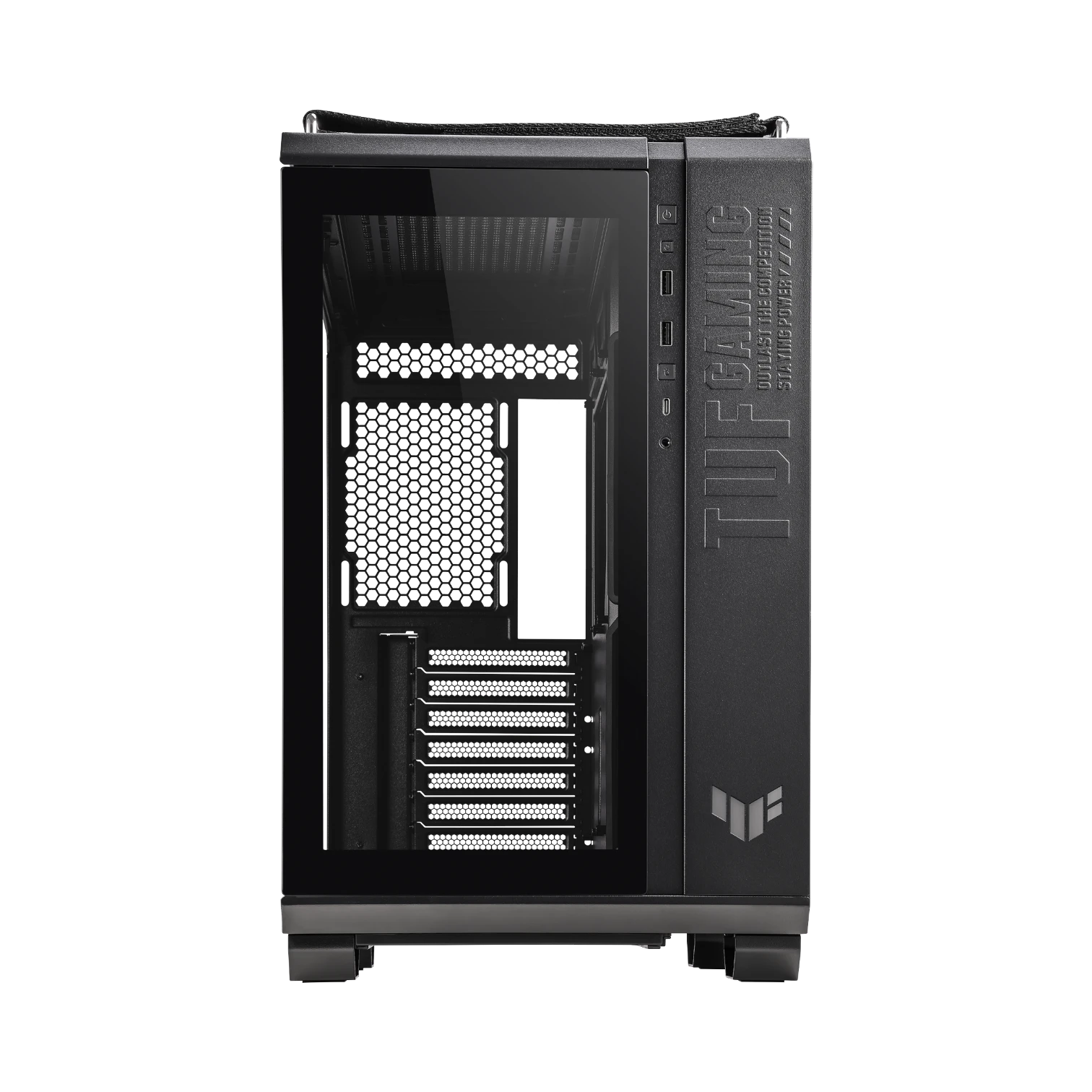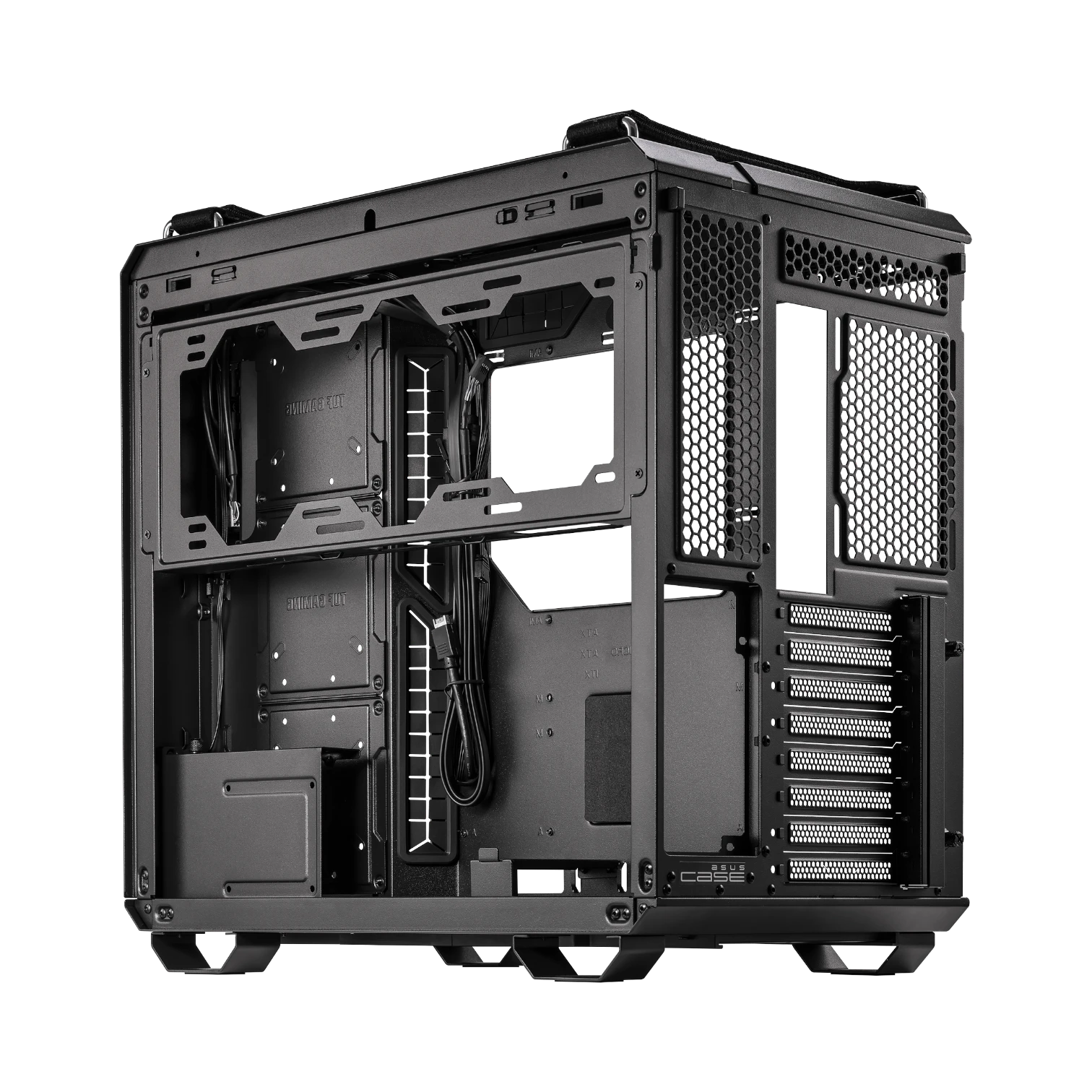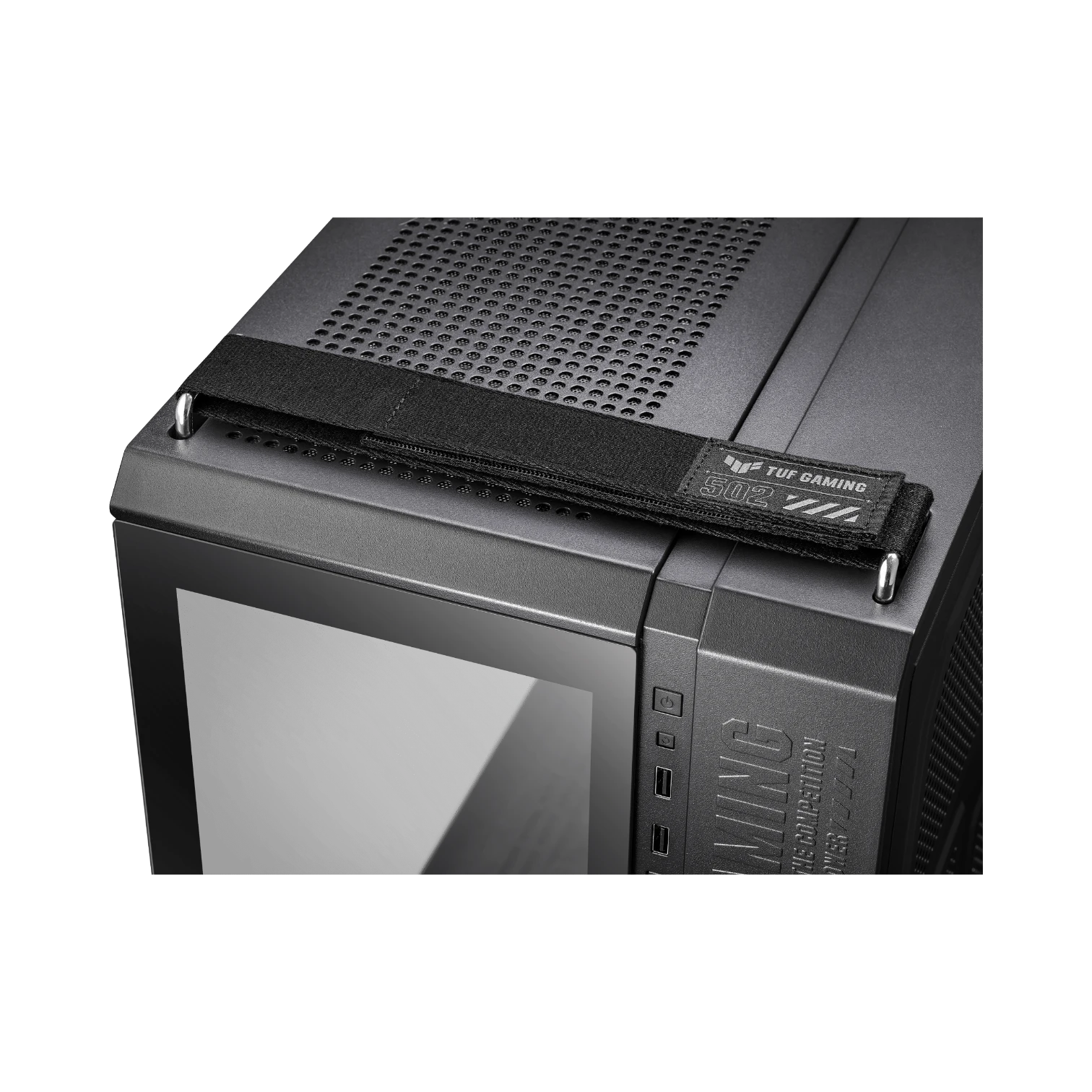 The ASUS GT502 TUF GAMING CASE/BLK is a mid-tower PC chassis designed to optimize airflow and hardware organization for gaming and high-performance builds. Its dual chamber layout separates the motherboard, CPU cooler, and graphics card from the power supply and storage, promoting efficient cooling and reducing cable clutter. The case supports motherboards up to ATX size and accommodates large components like graphics cards up to 400 mm long and CPU coolers up to 163 mm tall, making it a versatile choice for custom PC builders.