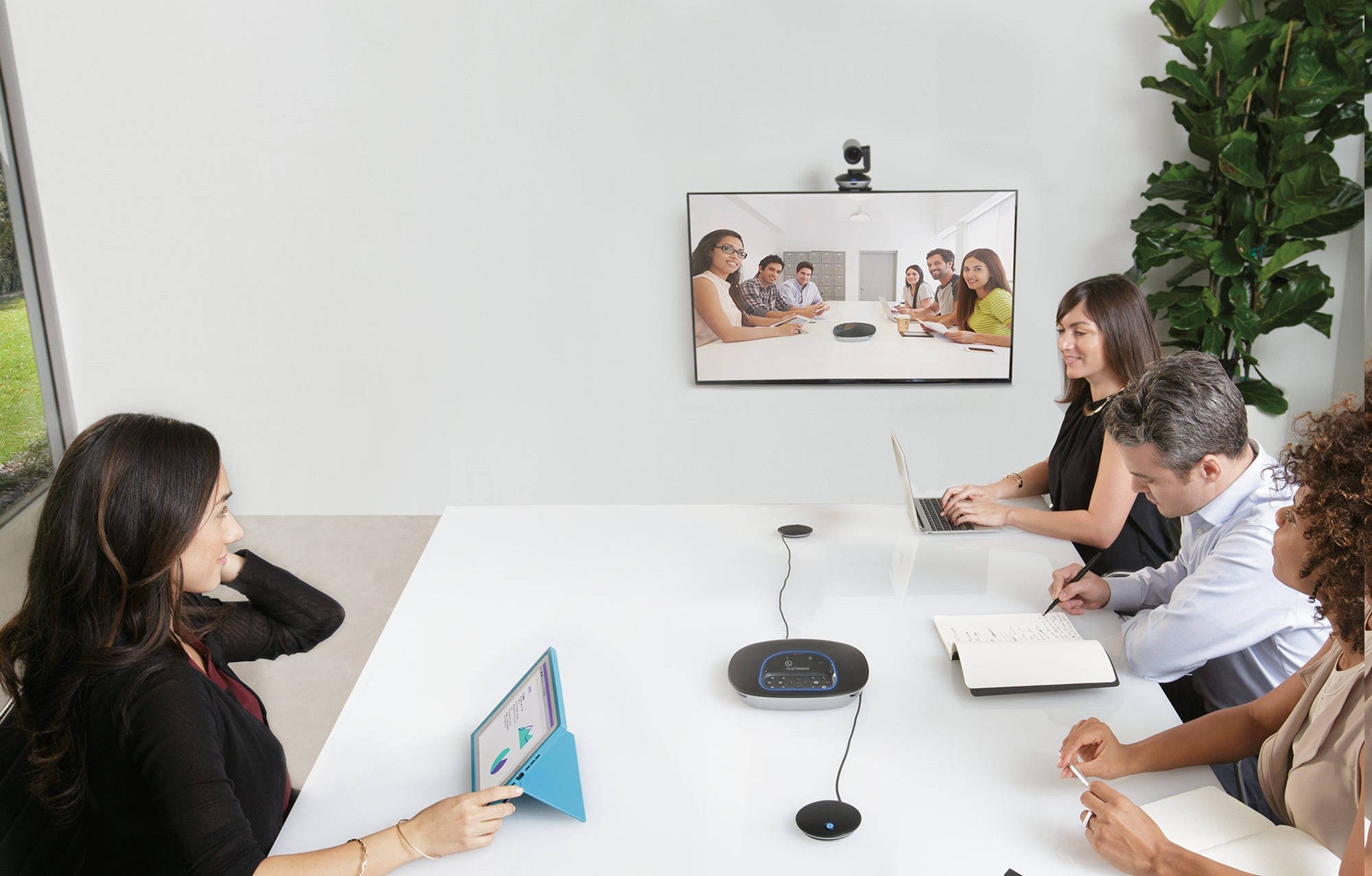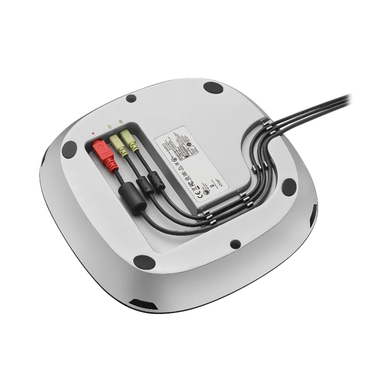 - Tabletop speakerphone combined with expansion microphones to capture voices clearly from all corners of the room