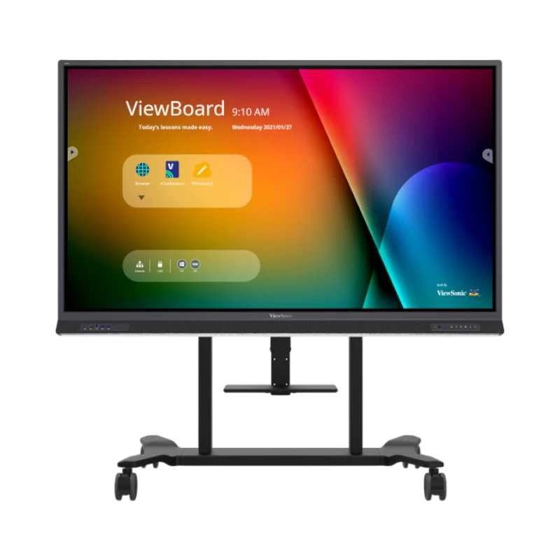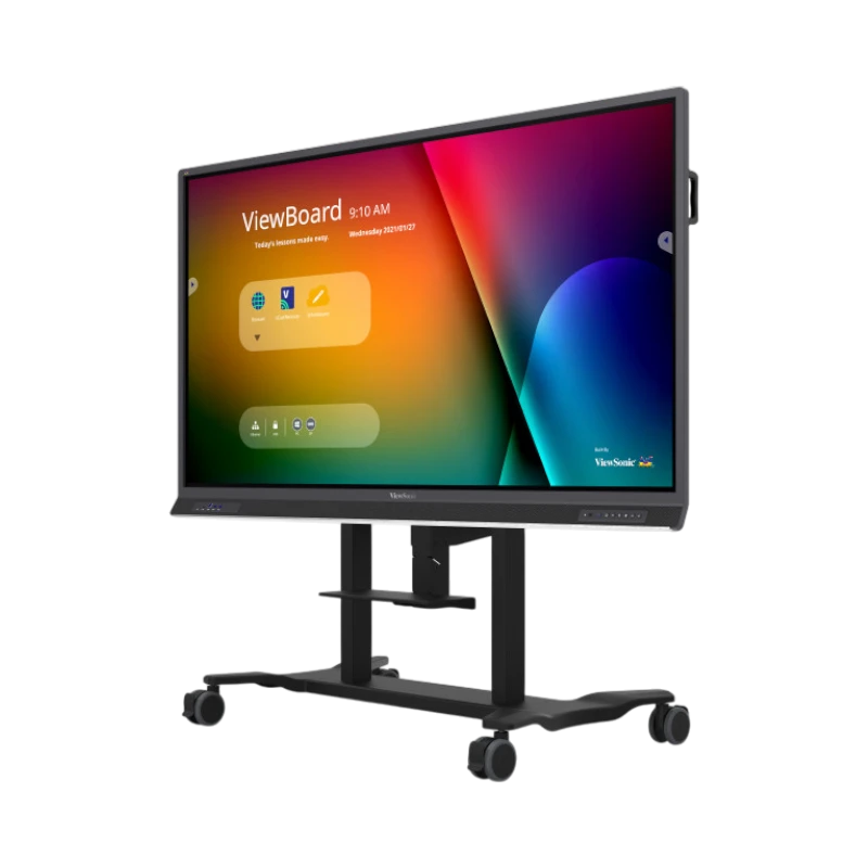 The ViewSonic VB-STND-007 is a motorized trolley cart designed to provide smooth and flexible mobility for large displays ranging from 55 to 86 inches. It supports weights up to 165 pounds and features a motorized lift with 22 inches of vertical travel, allowing users to adjust screen height easily via onboard buttons or the ViewBoard app. Its sturdy steel frame rolls quietly on carpet or hard floors, making it ideal for dynamic environments like classrooms, training centers, and collaborative workspaces.