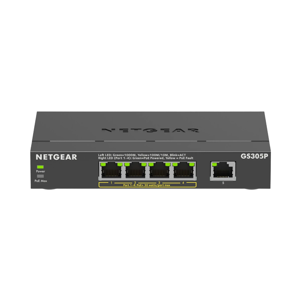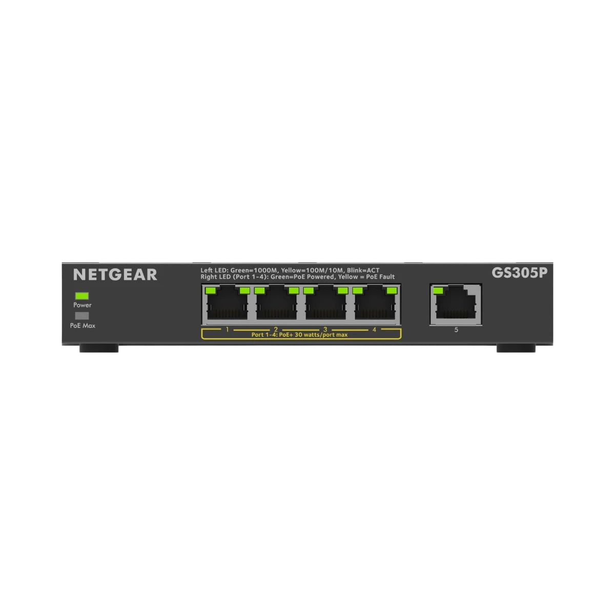 The NETGEAR GS305P-300NAS is a 5-port Gigabit Ethernet switch designed to provide both high-speed data connectivity and Power over Ethernet Plus (PoE+) on four of its ports. It delivers up to 30 watts of power per port, allowing you to power devices like IP cameras, VoIP phones, and wireless access points through a single network cable. With a total power budget of 63 watts and a switching bandwidth of 10 Gb/s, this unmanaged switch supports smooth data transfer and reliable network performance in small business, home office, or retail environments.