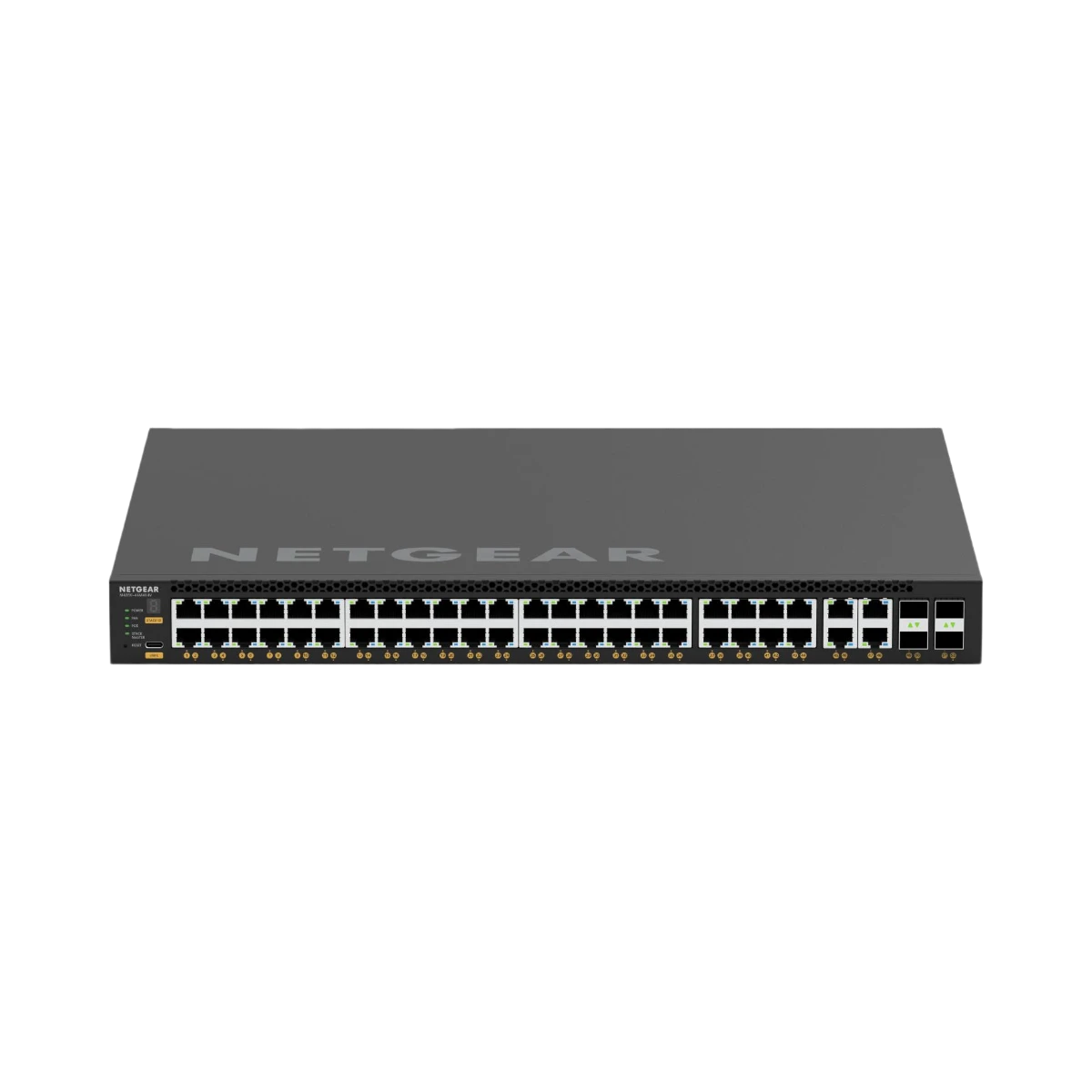 The NETGEAR MSM4352-TAANES is a managed Ethernet switch designed for AV installations that require both reliable data delivery and high-quality audio or video transport. It features forty-eight ports, including forty-four PoE++ 2.5 Gigabit connections for powering devices and four 10 Gigabit uplinks for high-speed aggregation or backbone links. This combination allows seamless operation of cameras, touch panels, access points, and controllers while handling large file transfers and high-bitrate streams without bottlenecks.