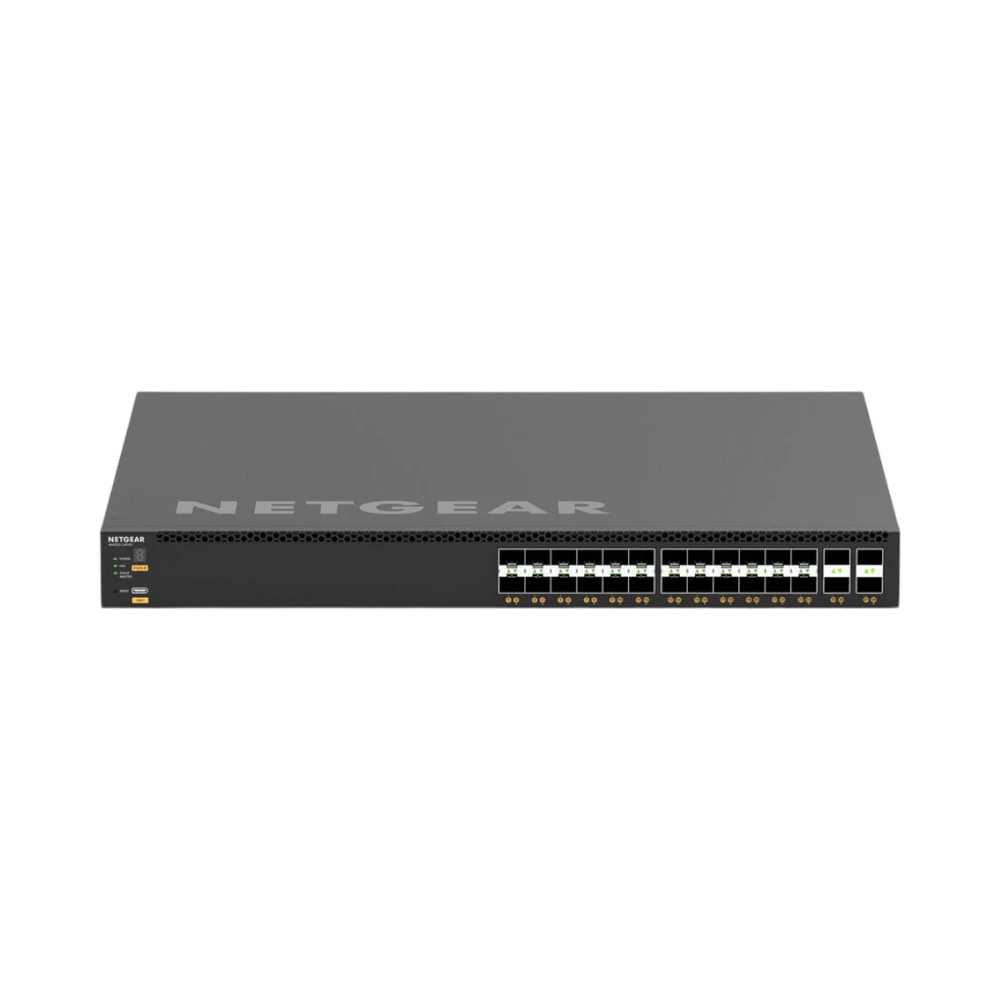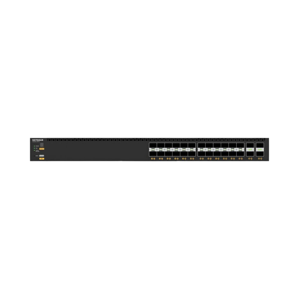 The NETGEAR XSM4328FV-100NES is a managed AV network switch designed to handle high-bandwidth audio and video traffic across IP networks. It features 24 SFP+ ports delivering up to 10 Gb/s each and four SFP28 uplinks capable of 25 Gb/s, making it well suited for uncompressed 4K video walls, live production setups, and dense workstation clusters. With a switching capacity of 680 Gb/s, it efficiently manages multicast traffic and supports advanced Layer 2 and Layer 3 networking functions to maintain low latency and flexible traffic segmentation.