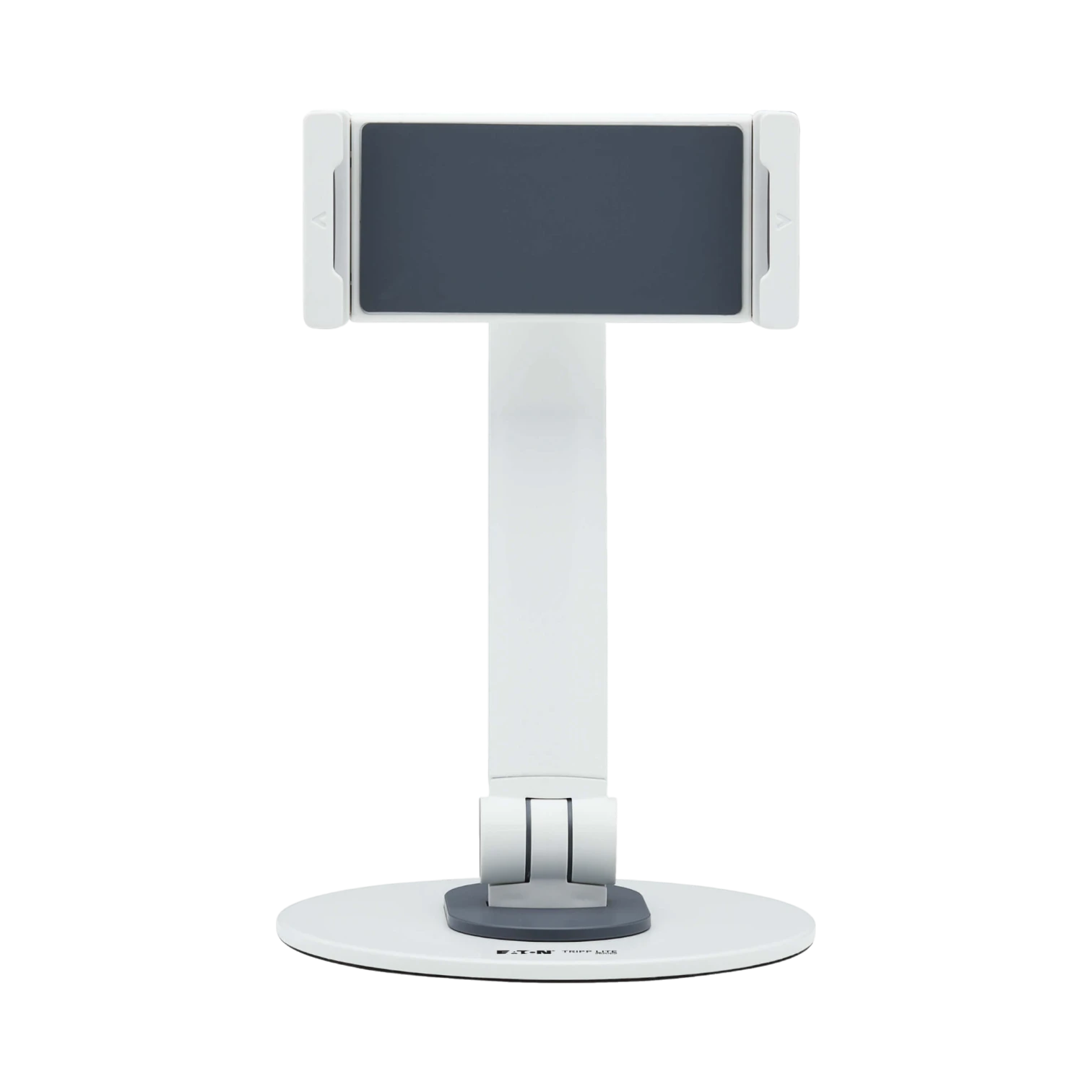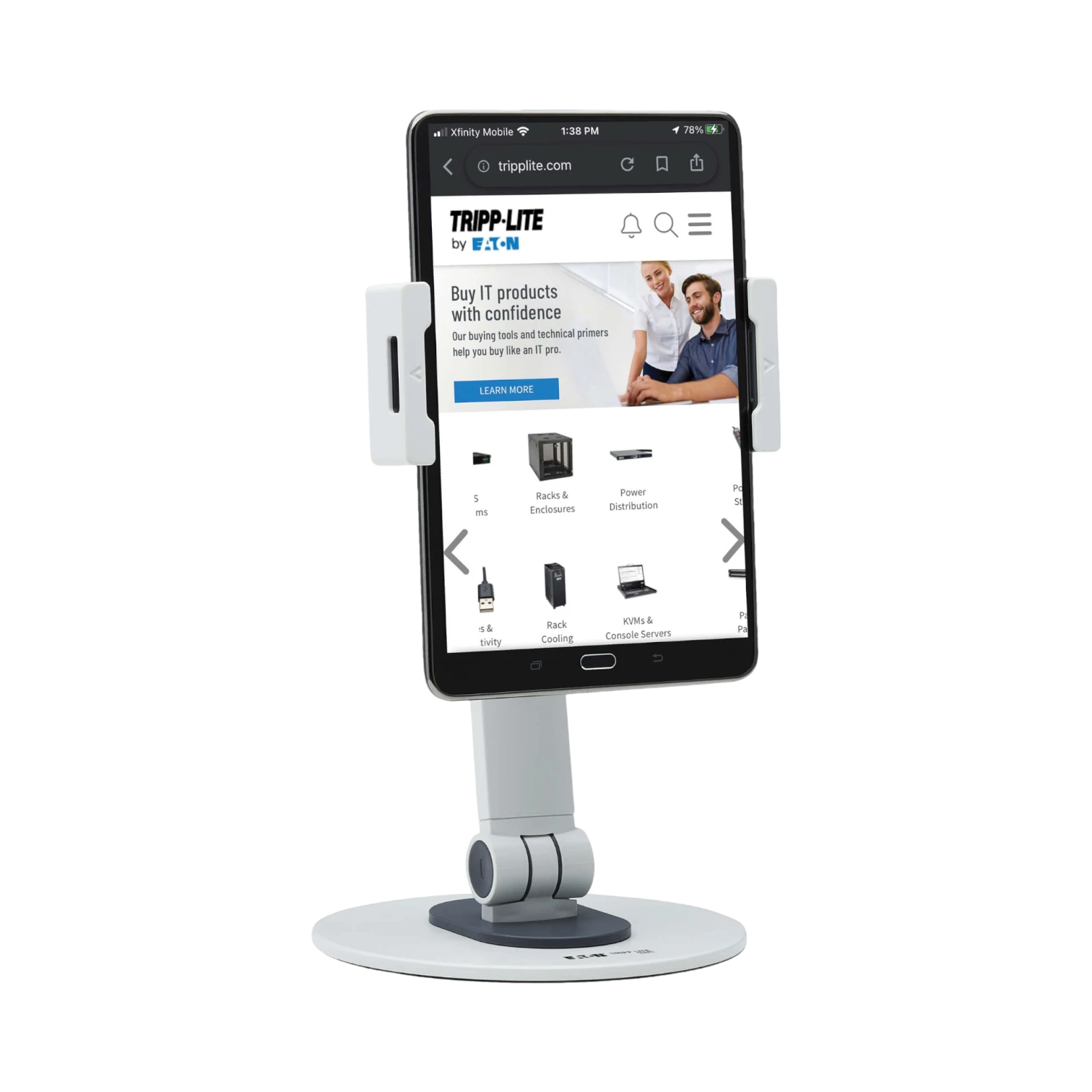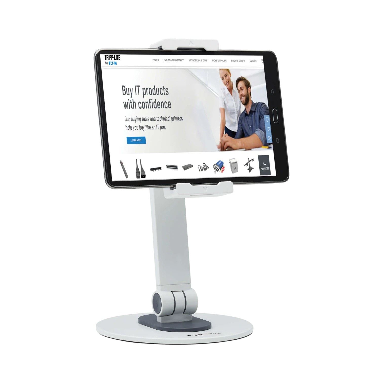 The Tripp Lite DMTB413 is a full-motion desktop mount designed to securely hold smartphones and tablets ranging from 4.7 to 12.9 inches in size. It supports devices weighing up to 2.2 pounds, making it compatible with most current phones and many popular tablets, whether they have protective cases or not. This mount allows you to position your device at the perfect angle for comfortable viewing and hands-free use in various settings such as home offices, classrooms, retail counters, or workbenches.