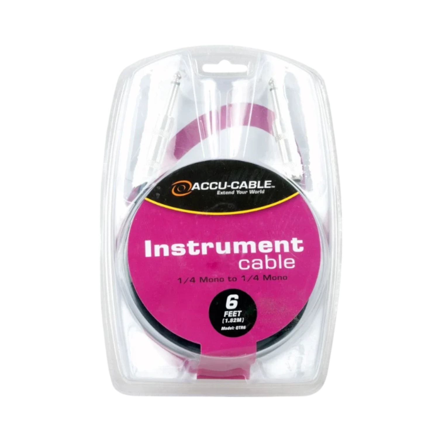 The ADJ QTR6 is a 6-foot instrument cable designed to carry an unbalanced mono signal through 1/4 inch TS connectors at both ends. It serves as a reliable connection between instruments like guitars, basses, keyboards, and drum machines to amplifiers, direct boxes, or mixers. Its length balances reach and manageability, making it suitable for stage and studio setups without excess cable slack.