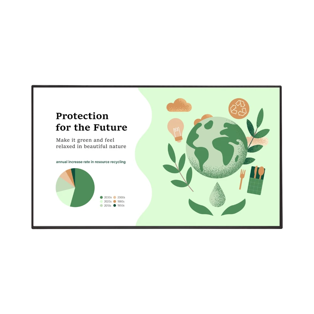 This commercial monitor fits well in environments that require continuous, high-quality visual communication. Retail stores can use it to display promotions and product information clearly, even under bright lighting. Control rooms benefit from its wide viewing angles and reliable uptime for monitoring critical data. Hotel lobbies and airport terminals can rely on its vivid 4K display and flexible mounting options to welcome guests and share real-time information effectively.