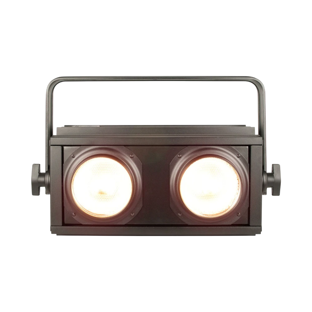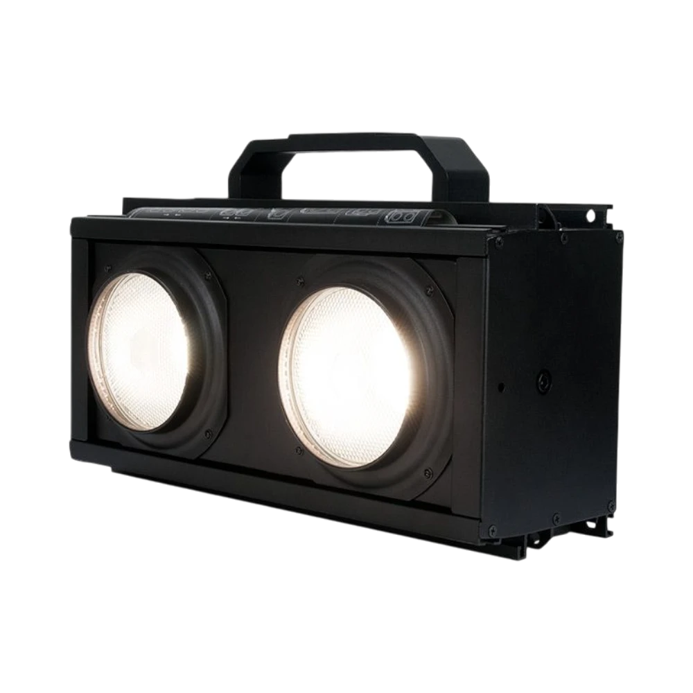 The ADJ ENC977 is a high-intensity dual lens blinder and strobe light designed to deliver powerful bursts of warm light or sharp strobe effects for live events. Featuring two 110 W warm white CREE COB LEDs, it produces a broad 50-degree beam angle with a default color temperature of 2700 K, which can be adjusted down to 1200 K for a tungsten-style glow. This fixture is well suited for festivals, theaters, clubs, and worship spaces where dynamic lighting can elevate the atmosphere or create subtle fades.