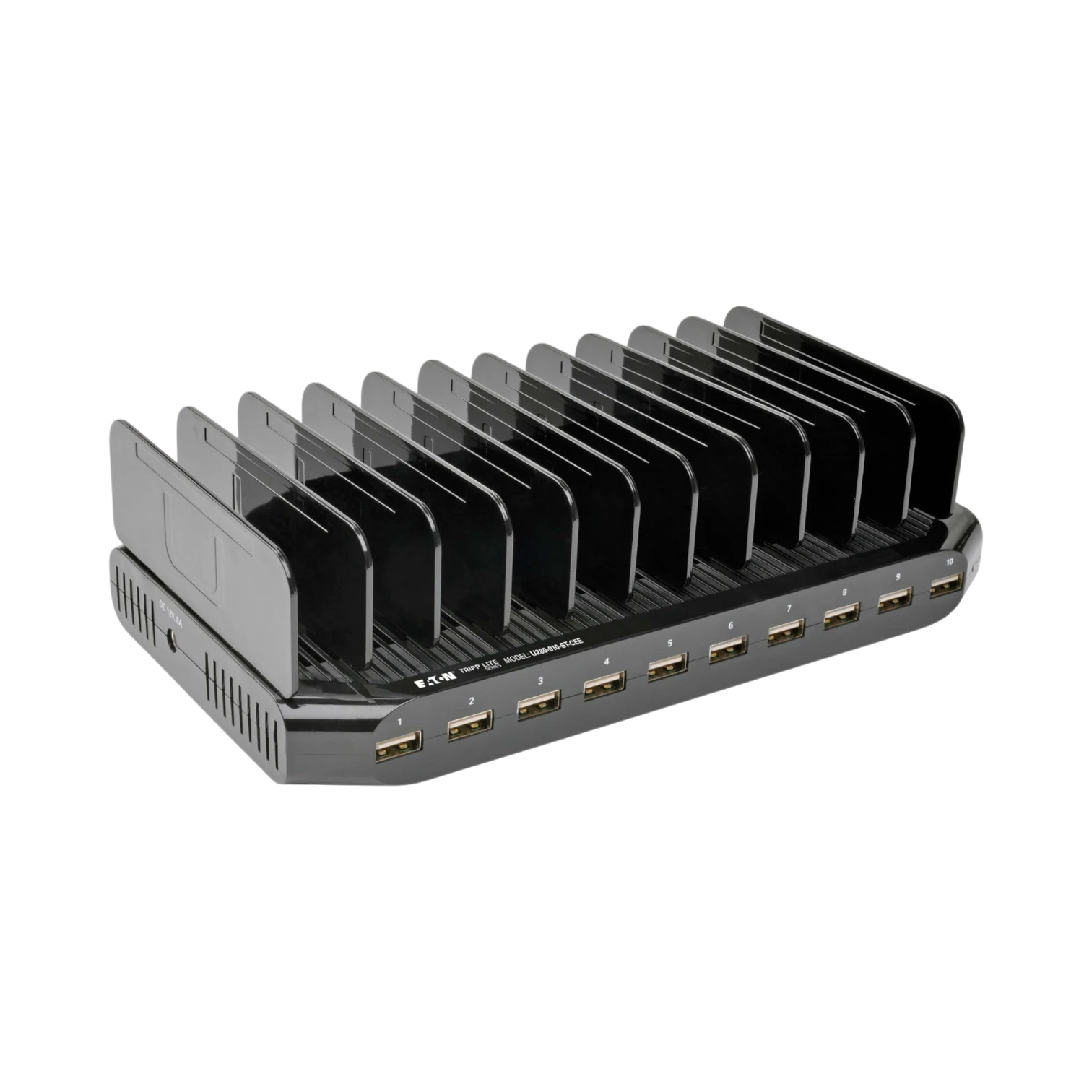 The Tripp Lite U280-010-ST-CEE is a 10-port USB charging station designed to keep multiple mobile devices powered and organized simultaneously. Each port delivers up to 5 V and 2.4 A, ensuring fast and reliable charging for phones, tablets, e-readers, and other USB-powered gadgets. Its adjustable storage brackets allow devices to stand upright, reducing cable clutter and keeping screens visible during charging. This station is ideal for busy environments like shared offices, classrooms, retail counters, or households where many devices need charging at once.