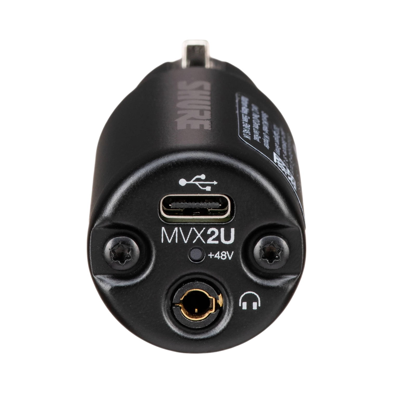 The Shure MVX2U is an XLR to USB-C streaming adapter that converts professional microphones into plug-and-play devices for computers. It features a clean preamp delivering up to 60 dB of gain, making it suitable for low-output dynamic microphones like the Shure SM7B. The adapter also provides automatic 48 V phantom power for condenser microphones, enabling immediate recording without additional equipment.
